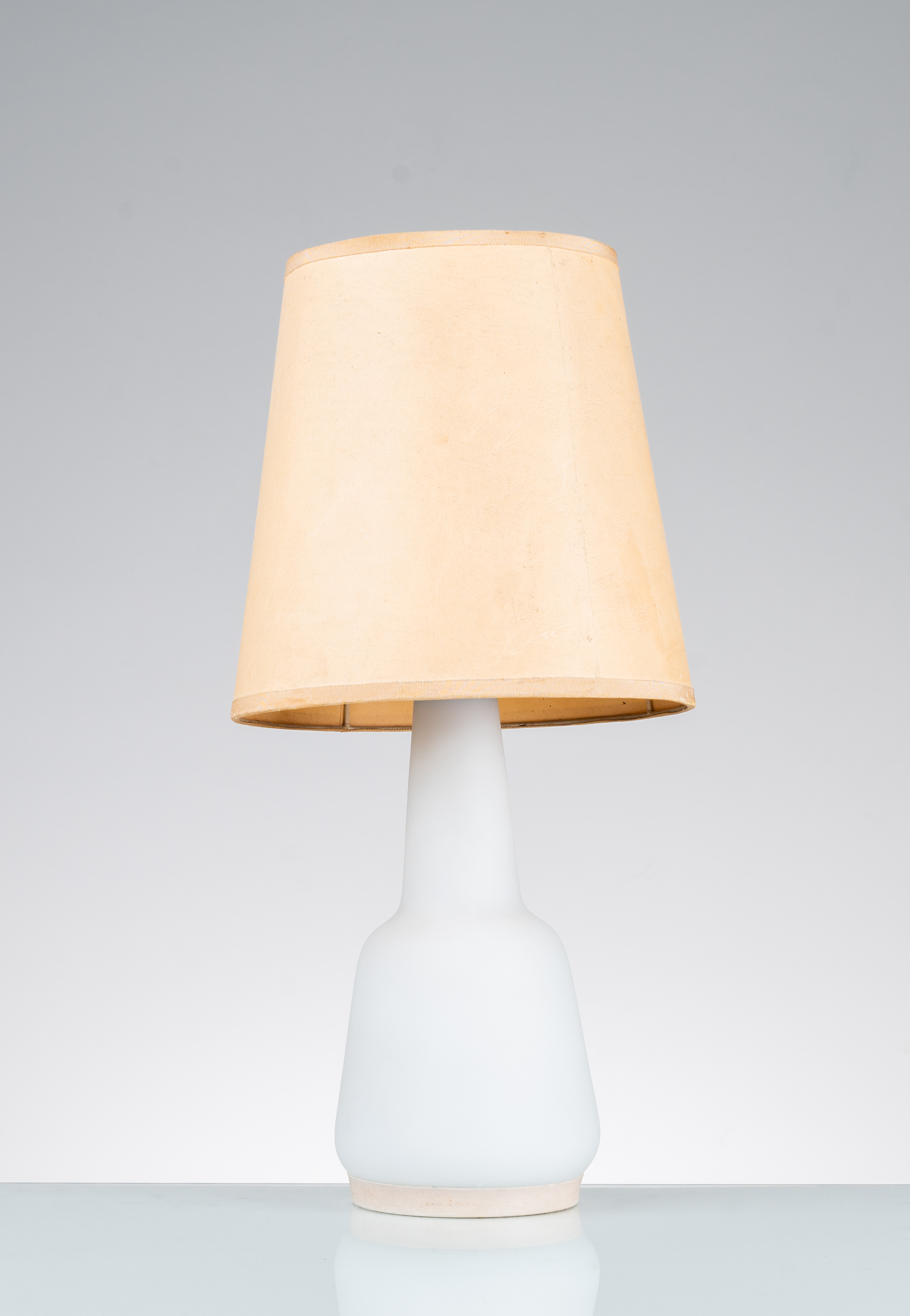 Lampada da tavolo ad una luce con base in vetro sagomato lattimo, base in metallo, diffusore in pergamena avorio.