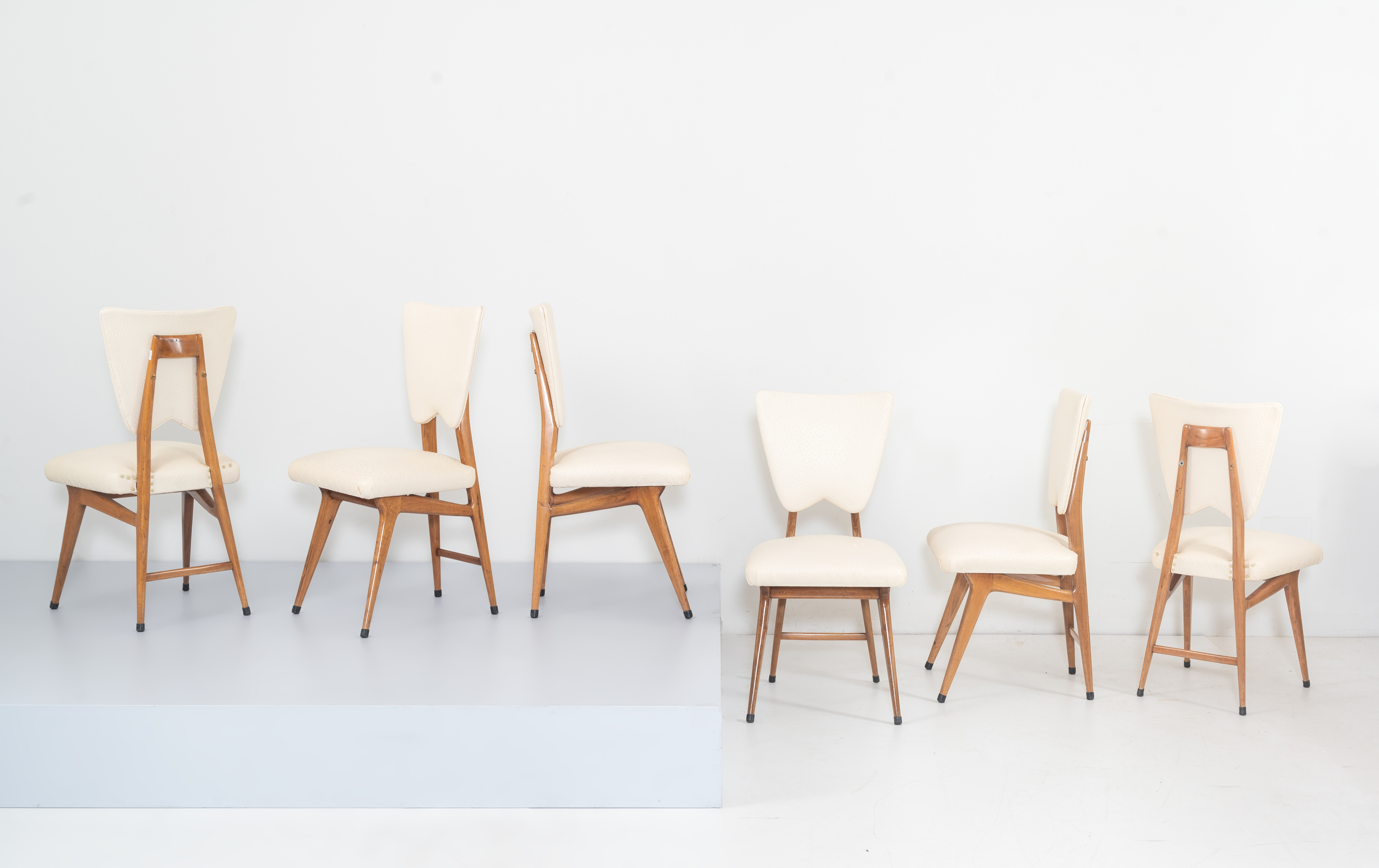 Sei sedie con struttura in legno, spalliera sagomata e seduta con imbottitura e rivestimento con skai effetto struzzo bianco.