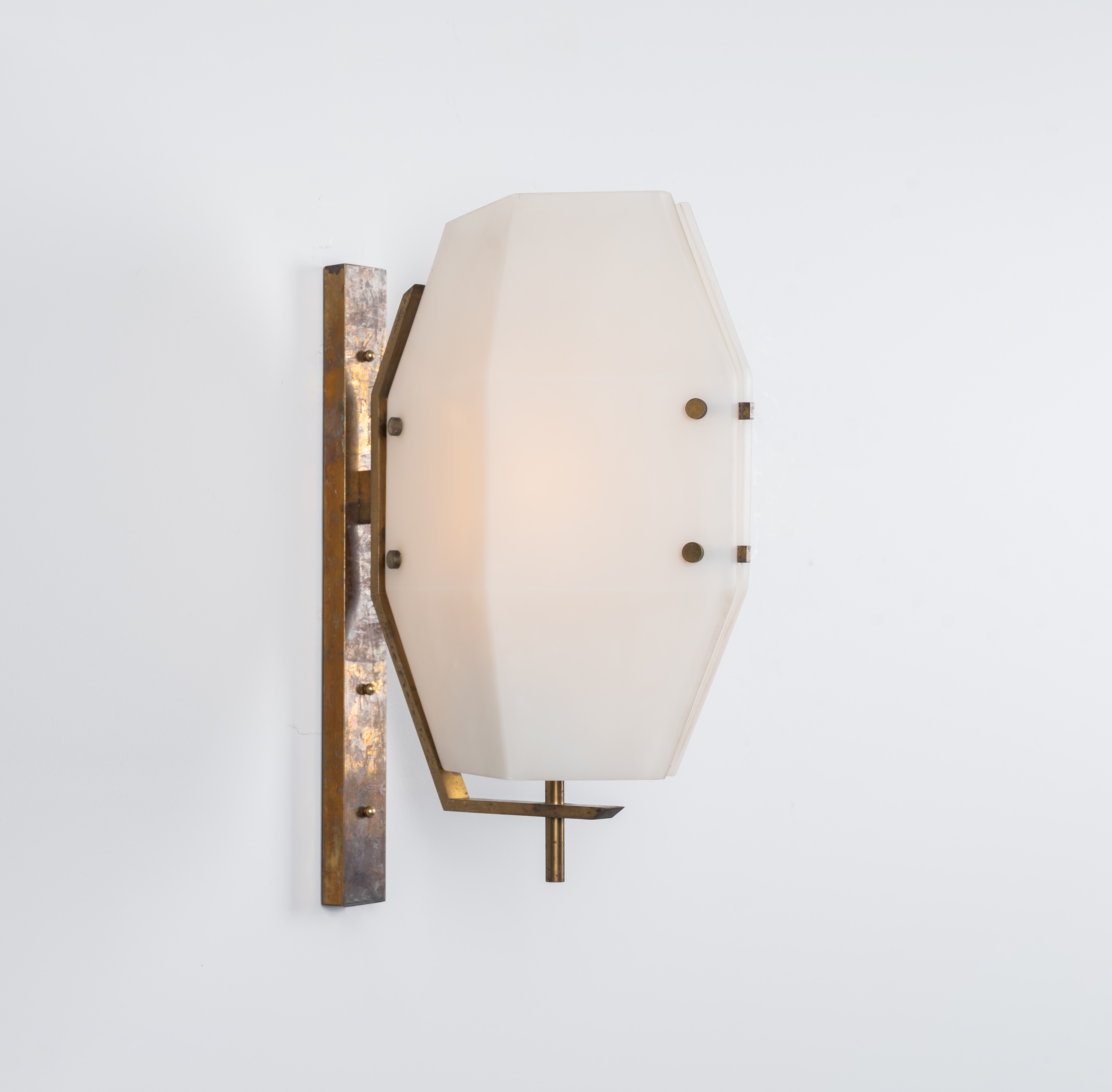 Lampada da parete ad una luce, variante del modello “12898” con struttura in ottone e diffusore ottagonale in vetro duplex opal bianco. Segni di uso.