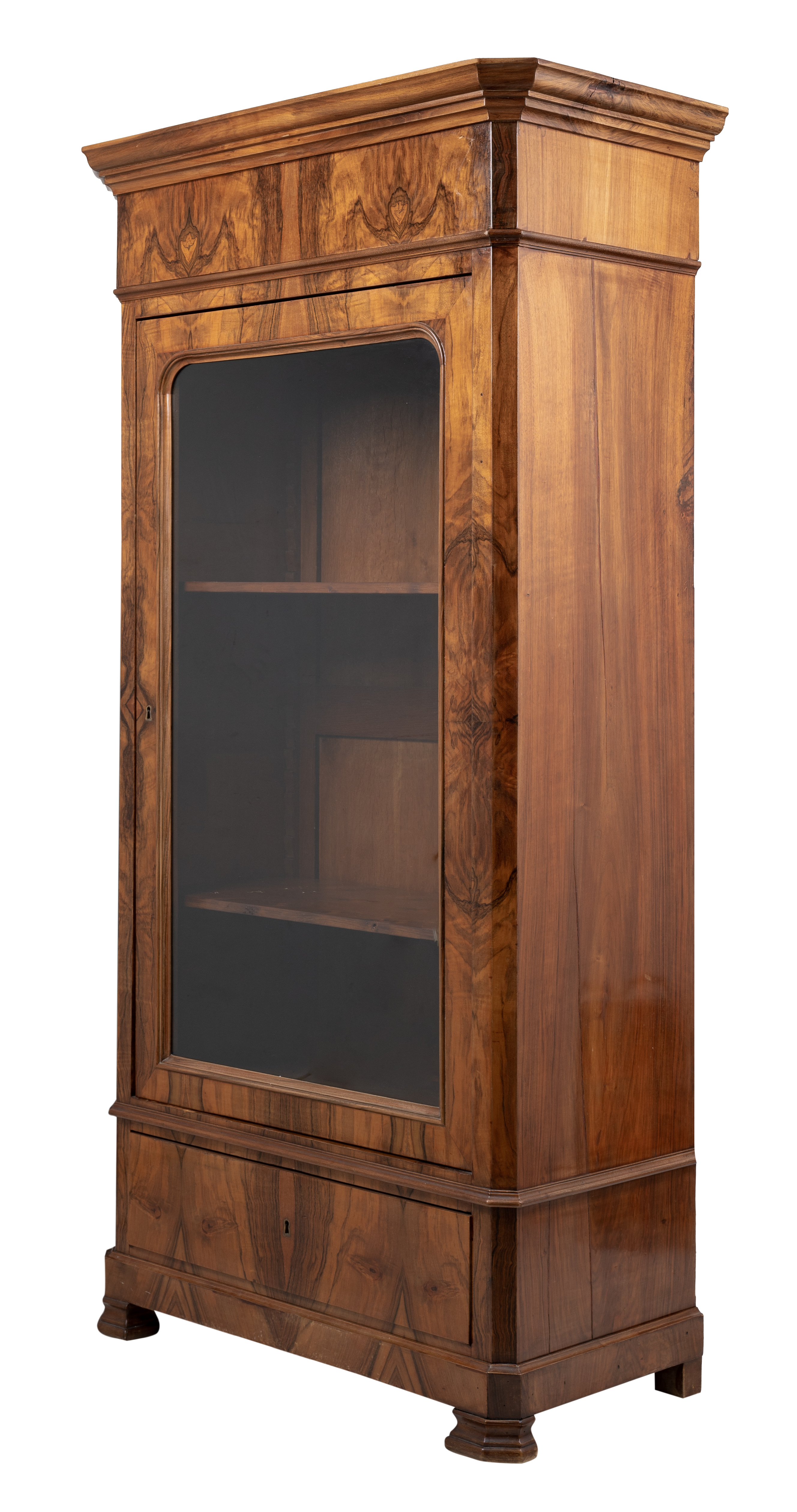 Libreria ad un'anta con cassetto in legno di noce e radica di noce.