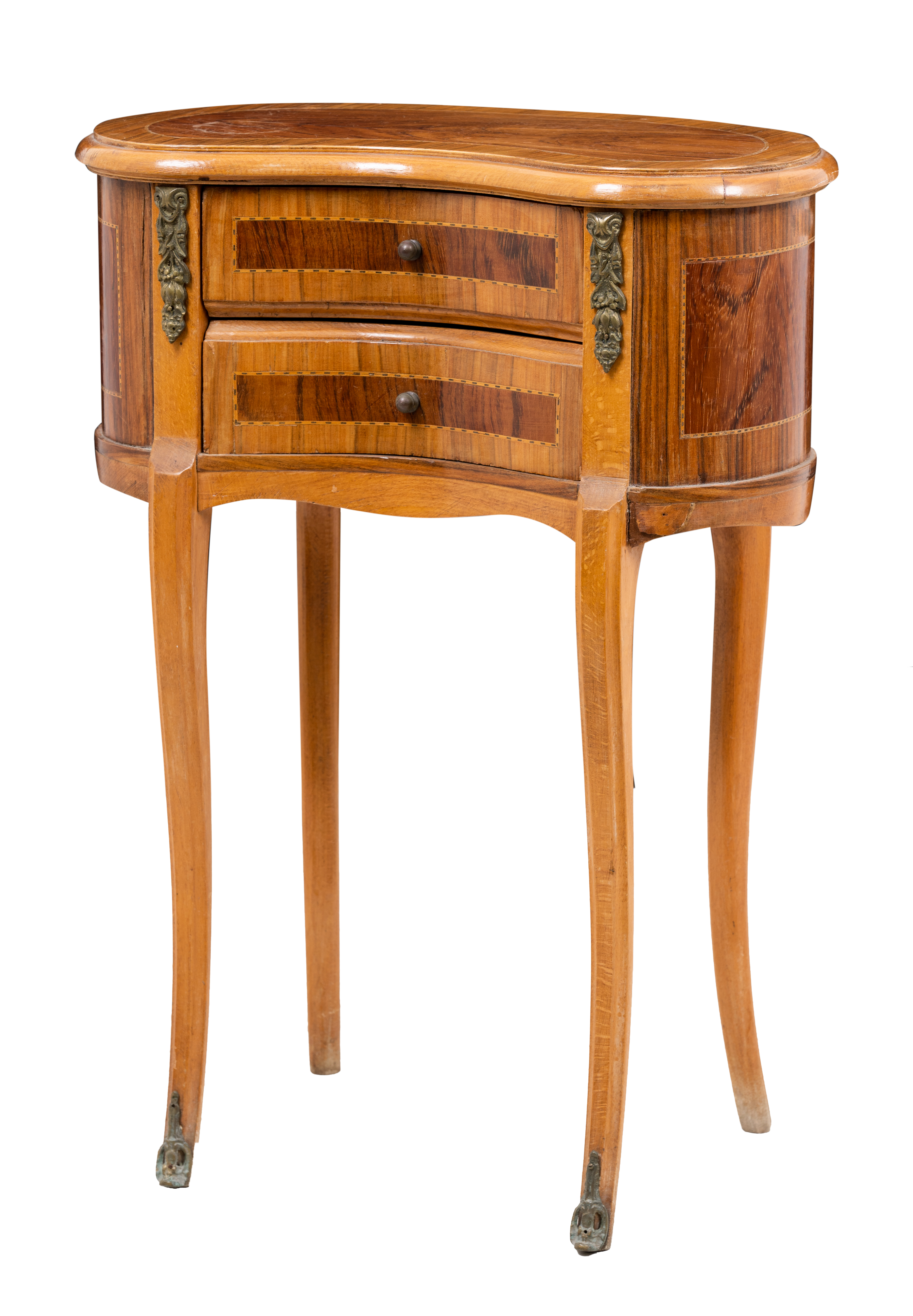 Piccolo mobile a fagiolo con due cassetti in legno rosa e noce.