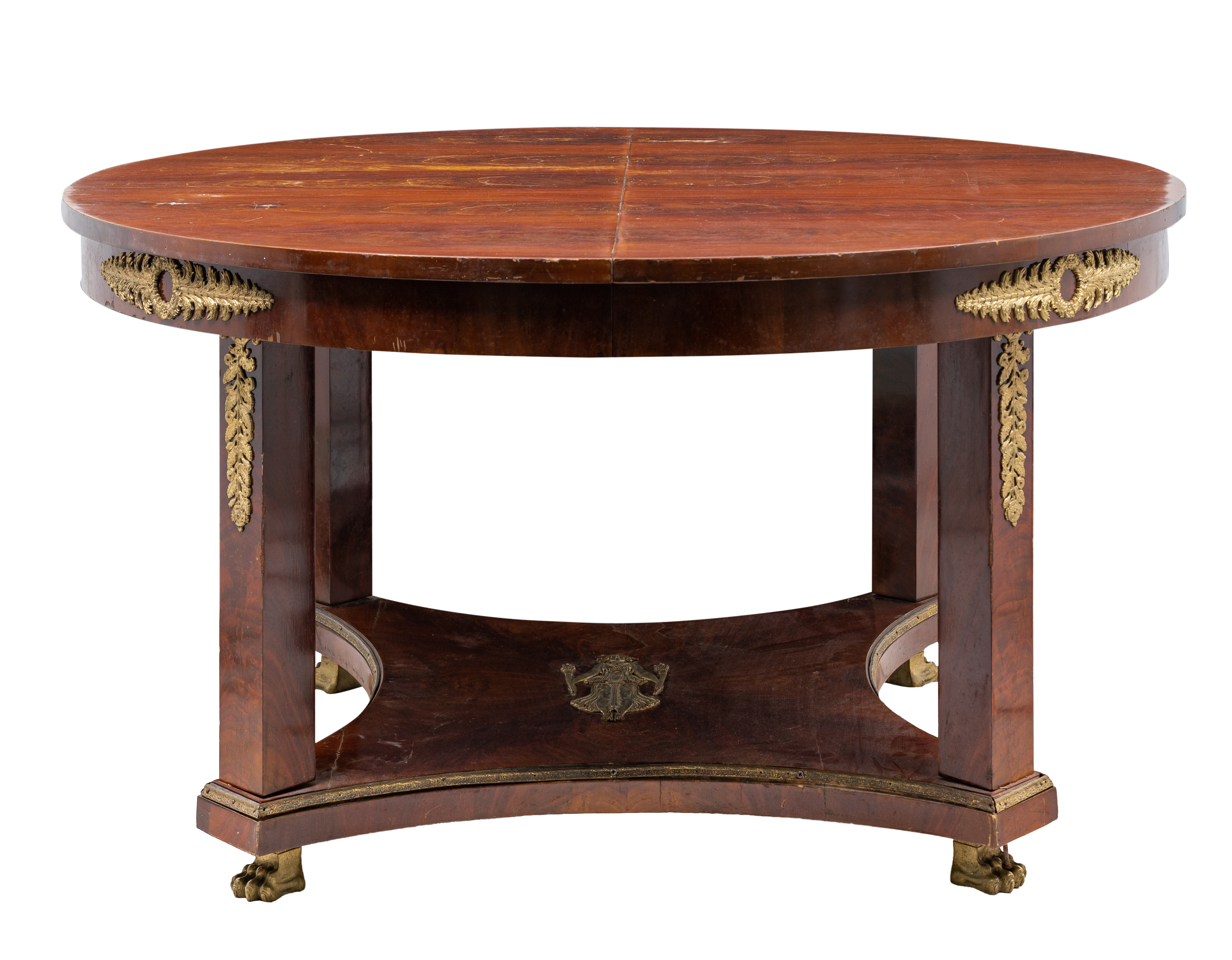 Tavolo circolare allungabile e dieci sedie stile Impero in legno di mogano e piuma di mogano, fregi in bronzo.
