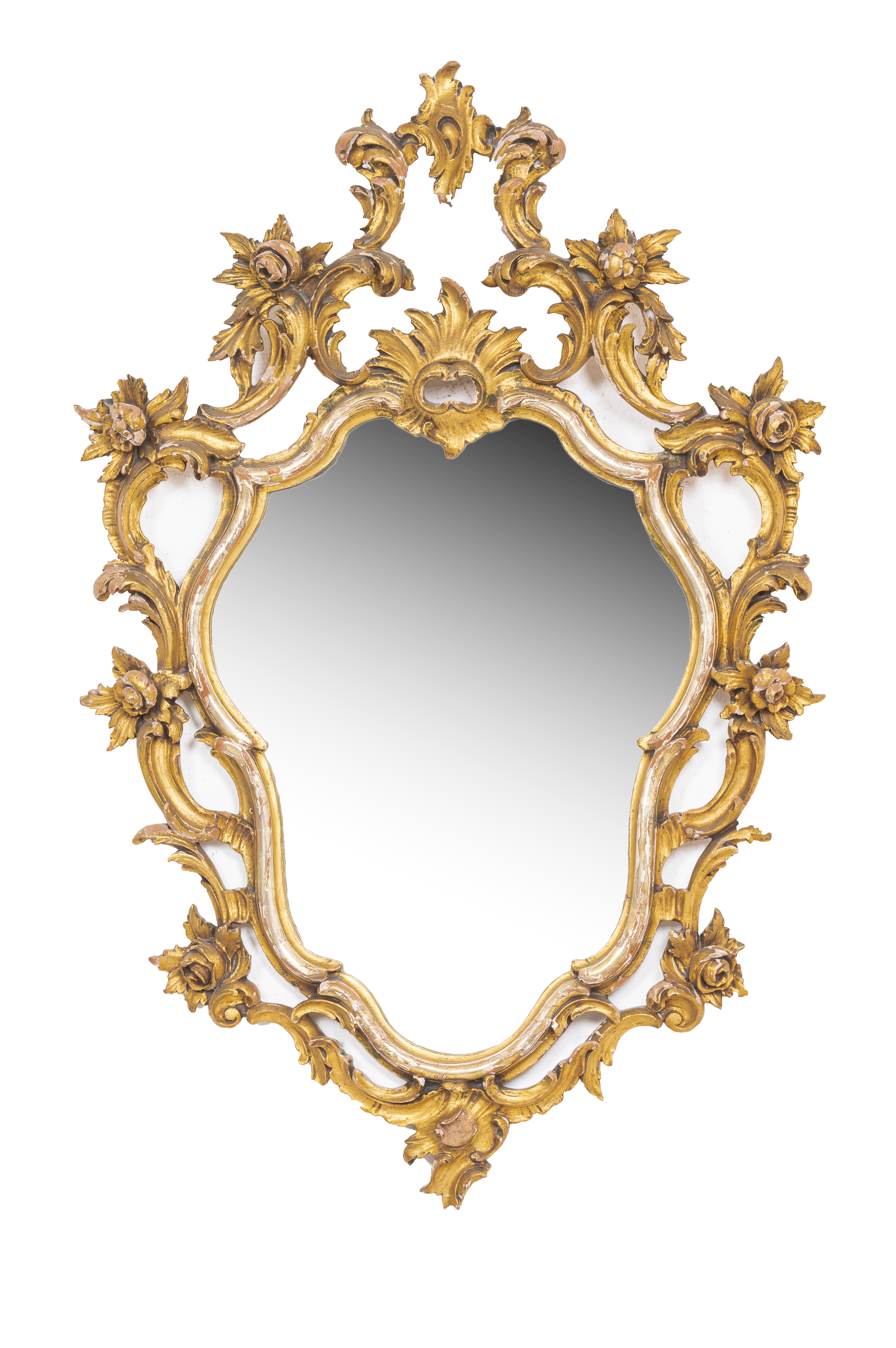 Specchiera a scudo in legno intagliato dorato e argentato (usure).