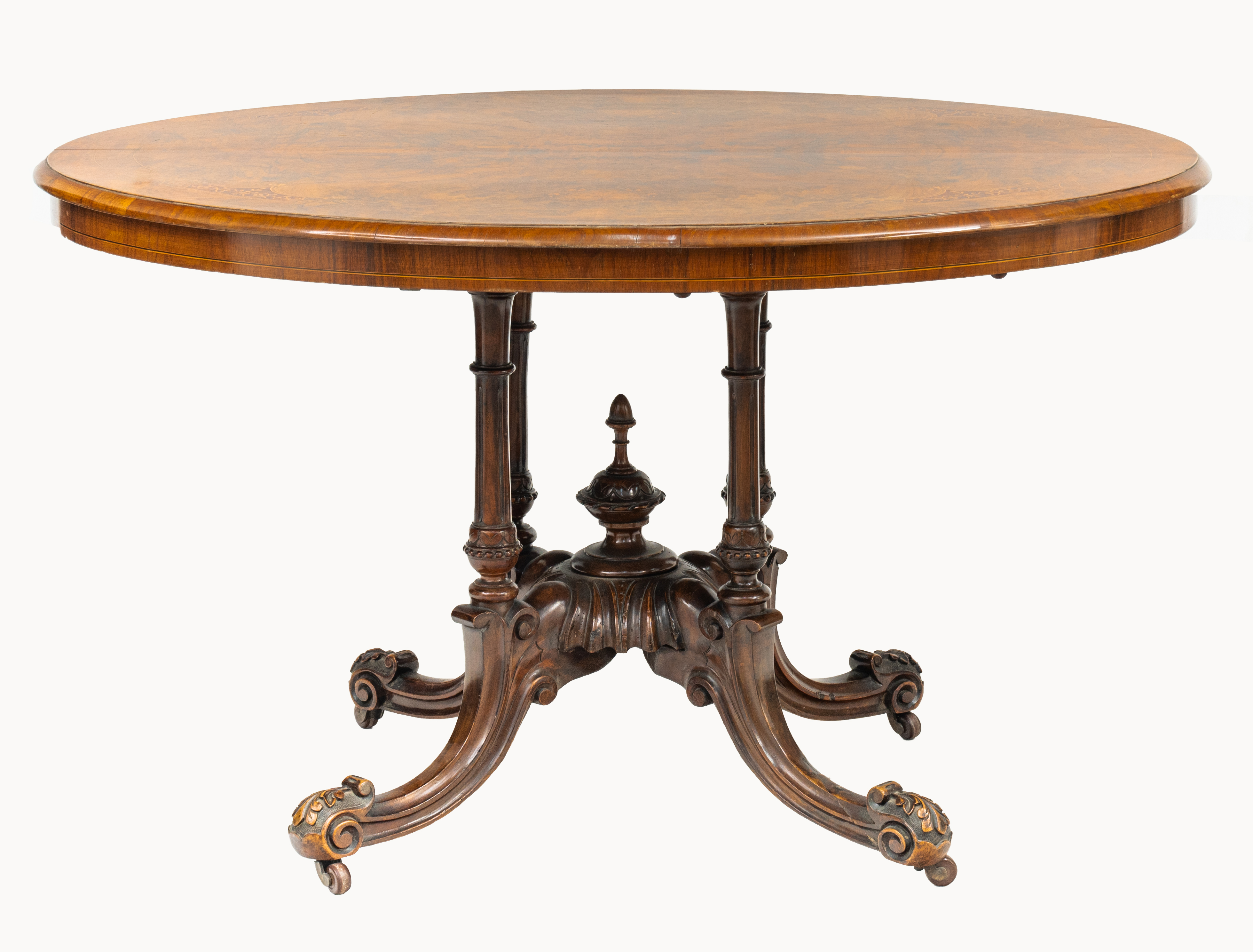 Tavolo da centro di forma ovale in legno di noce e radica di noce, tarsie in legno di bosso, di gusto vittoriano.