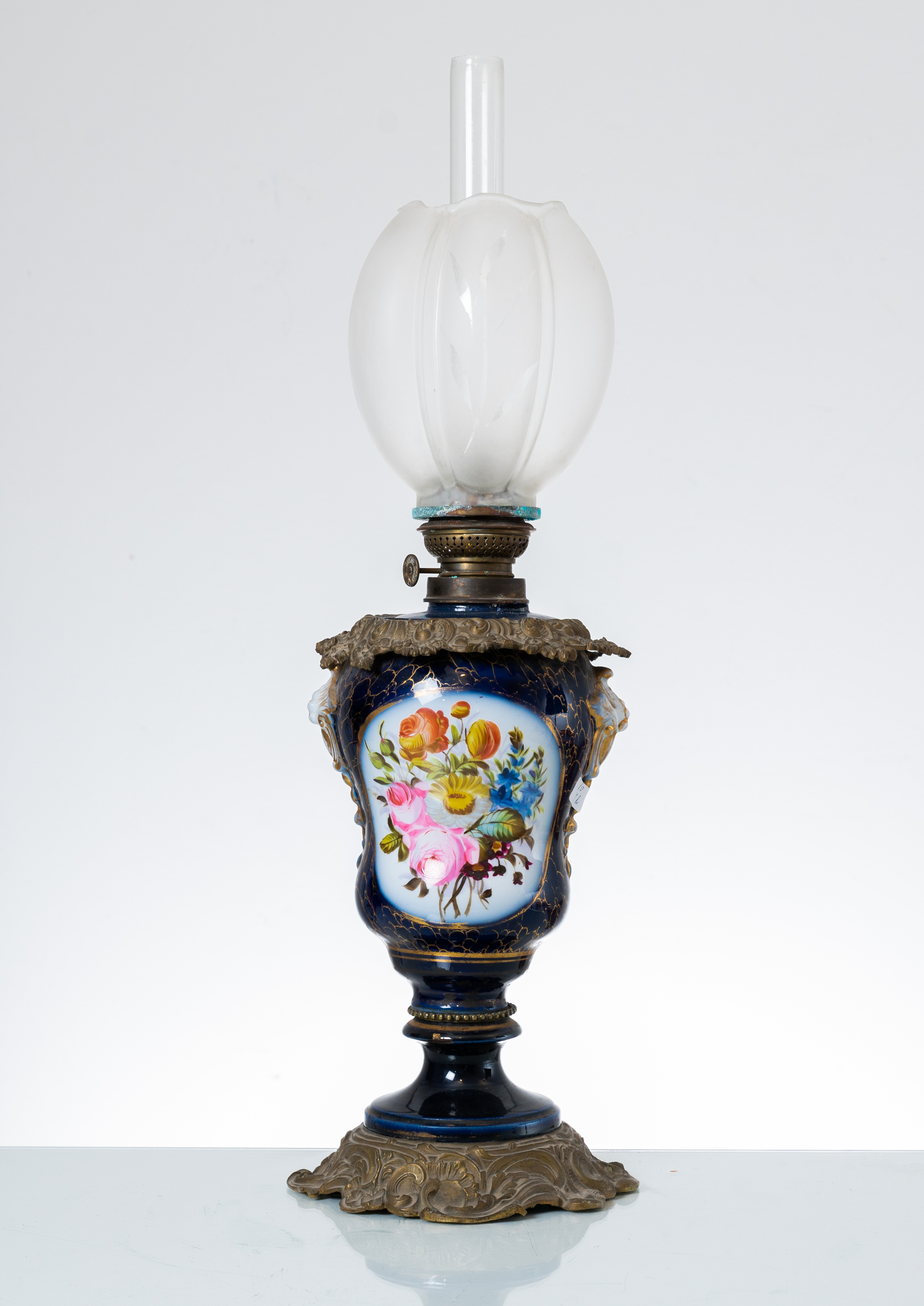 Lume a petrolio in porcellana blu dipinta a motivo floreale e fogliaceo, base e parte superiore in bronzo, boccia e tubo in vetro.