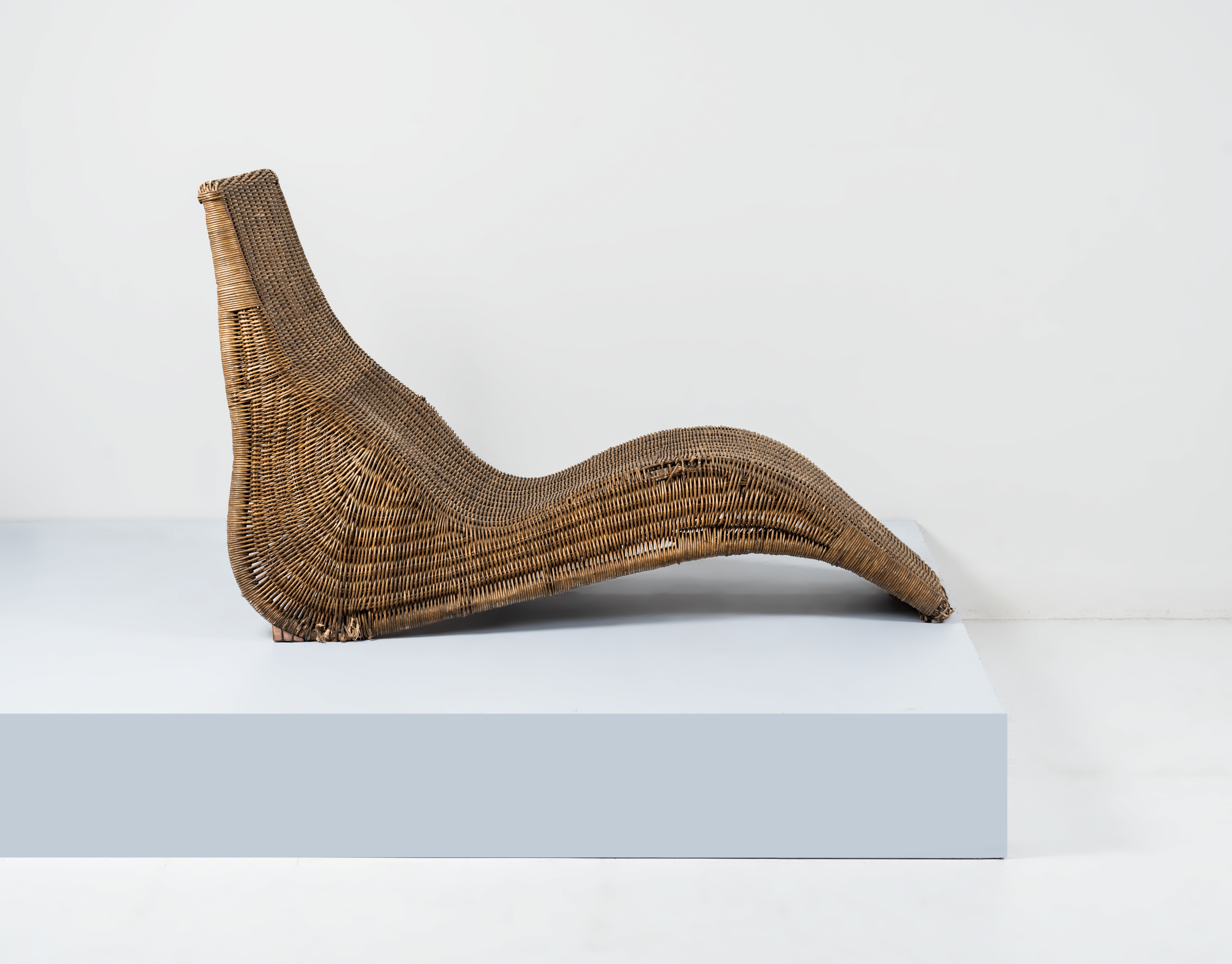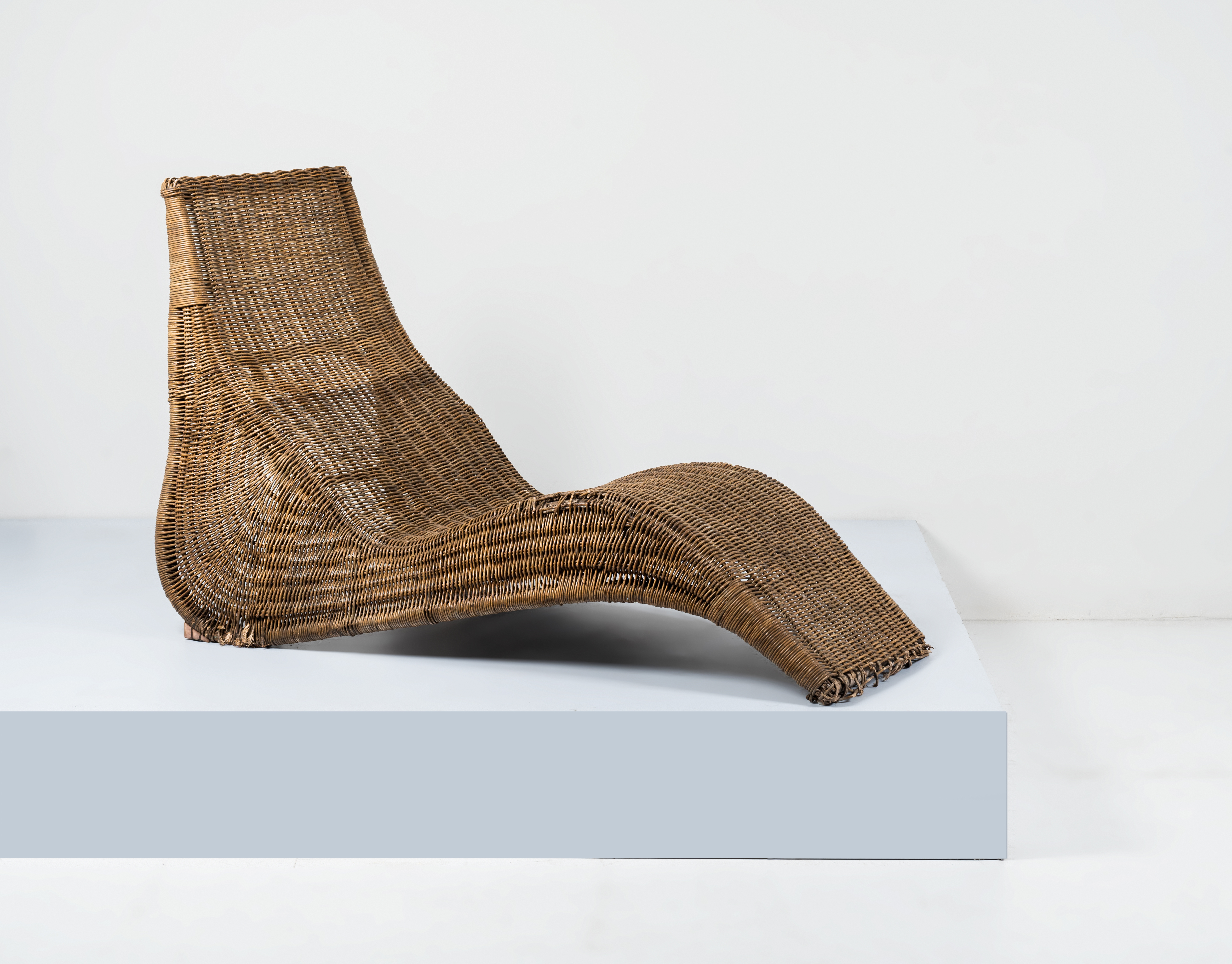Poltrona lounge modello “Karlskrona” con struttura in canna di bamboo e vimini. Segni di uso e difetti.
