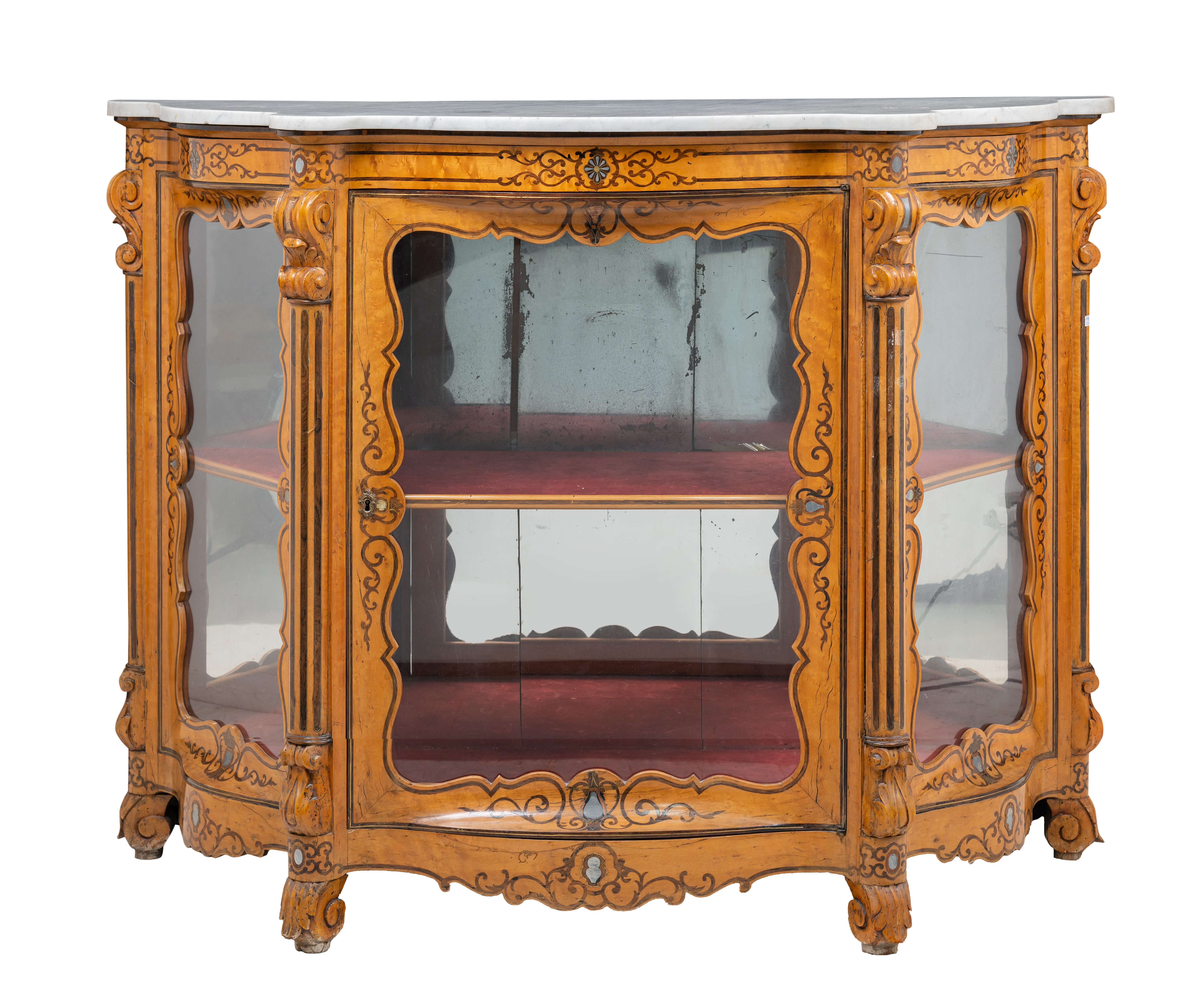 Etagere di forma sagomata a tre ante in legno di acero, tarsie in legno esotico e metallo, piano in marmo bianco venato.