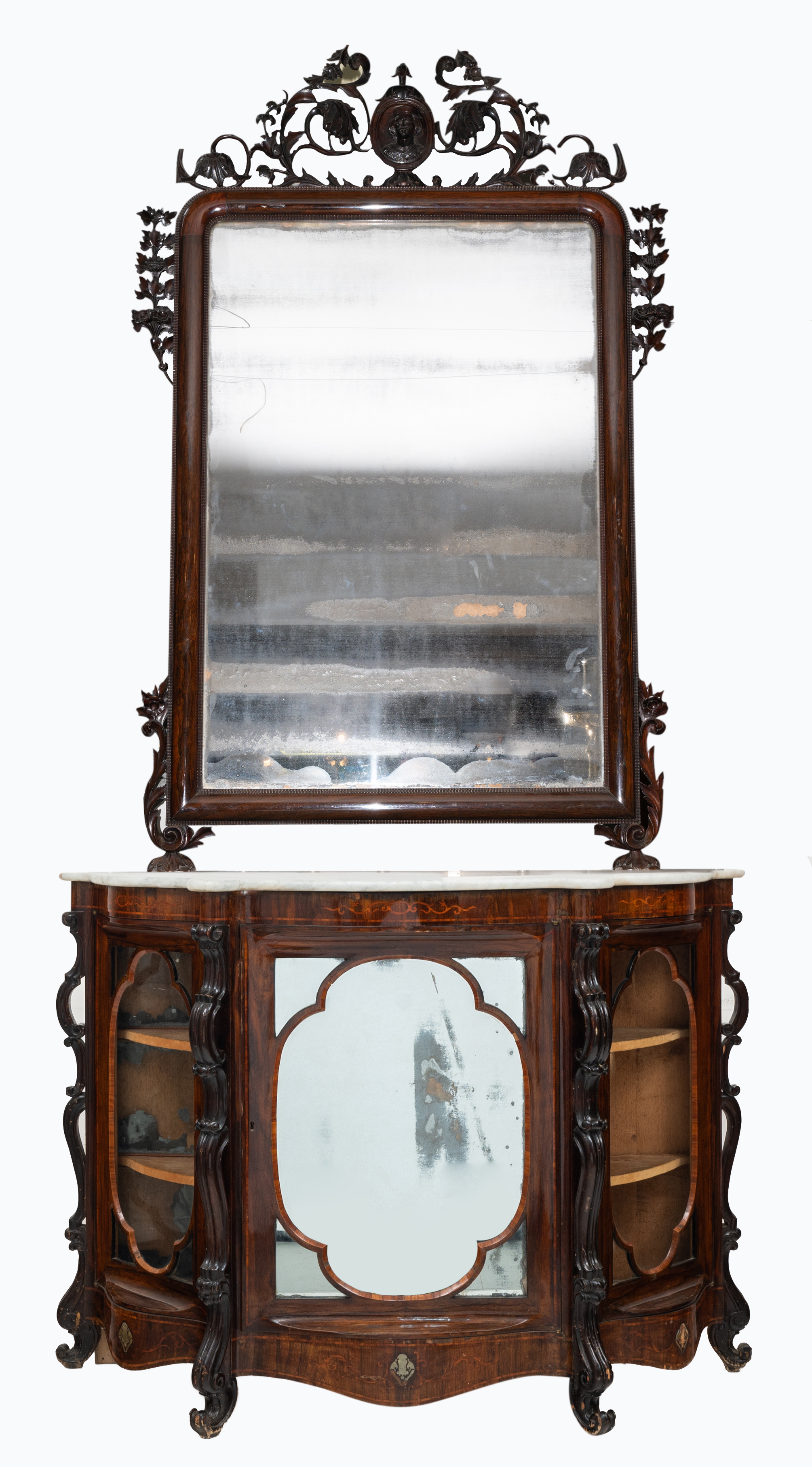Etagere Luigi Filippo di forma centinata con specchiera in legno esotico e noce, anta a specchio e due ante laterali a vetri, tarsie in bois de rose, piano in marmo bianco.