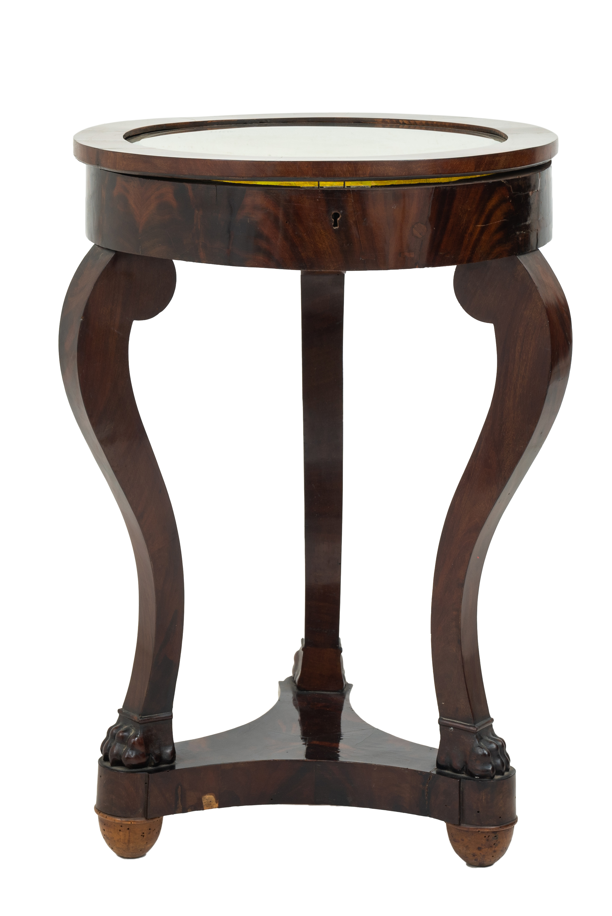 Tavolino/bacheca Impero in legno di mogano e piuma di mogano, gambe a sciabola e piedi a zampa leonina.
