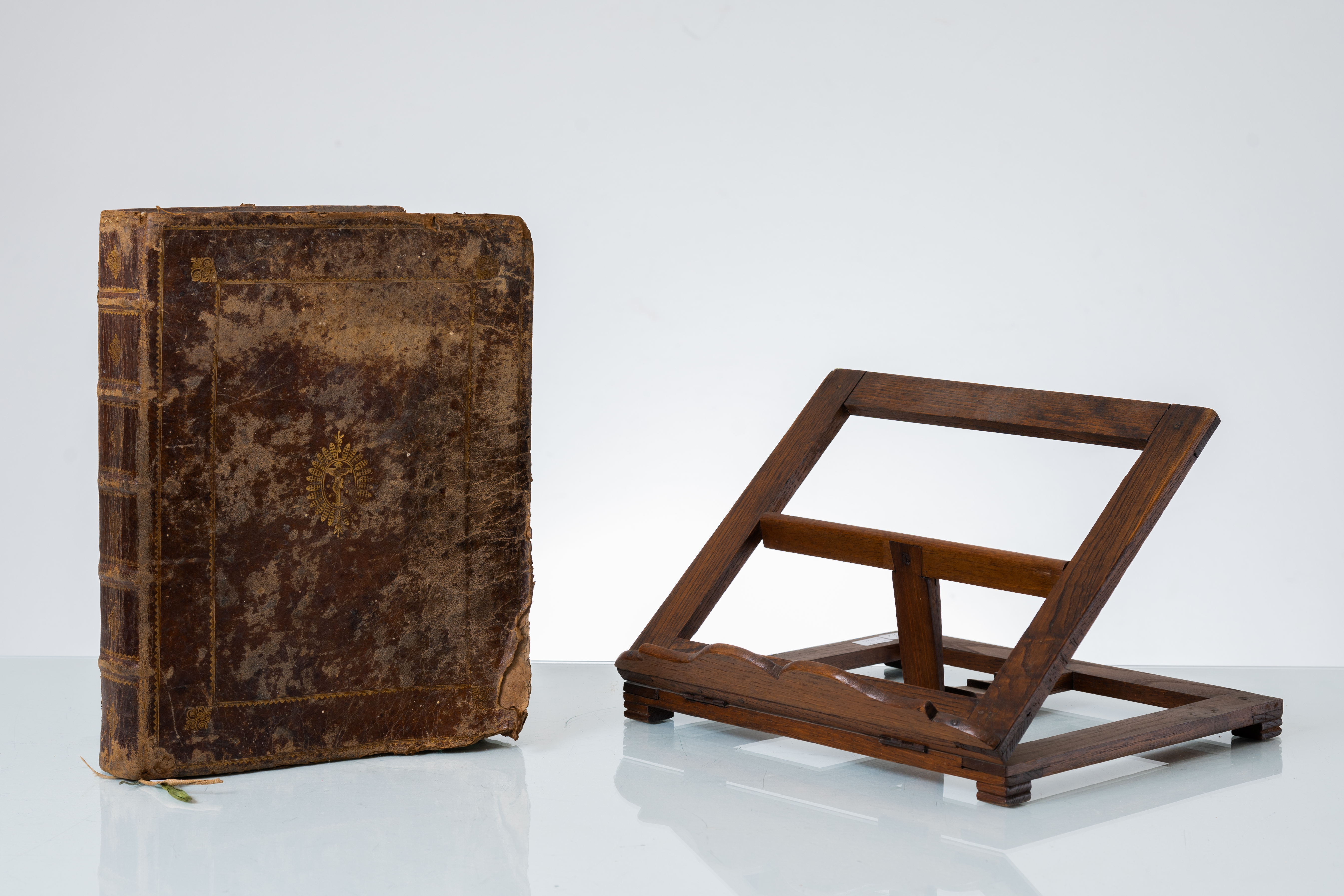 VOLUME CON LEGGIO: 1) MISSALE ROMANUM, mutilo di frontespizio, delle prime pagine e delle ultime. Edizione romana del 1714. In 4°. Belle incisioni xilografiche, con testatine, vignette, finalini ed incipit elegantemente incisi. Con il Martirologio Romano. Alcune delle prime pagine presentano mancanze all’angolo basso. Legatura originale in piena pelle con impressioni in oro a freddo ai piatti e al dorso. Cinque nervature al dorso e segna pagine in stoffa originali. In mezzo due stampati del 1754 relativi a “Missa Sancta Crucis” pubblicato a Trapani per i tipi di Gramignani che consta di 6 pagine e “Missae Propriae Sanctorum” pubblicato a Palermo per i tipi di Haeredem Aiccardi, che consta di n. 16 pagine. 2) LEGGIO IN LEGNO della prima metà del ‘900.