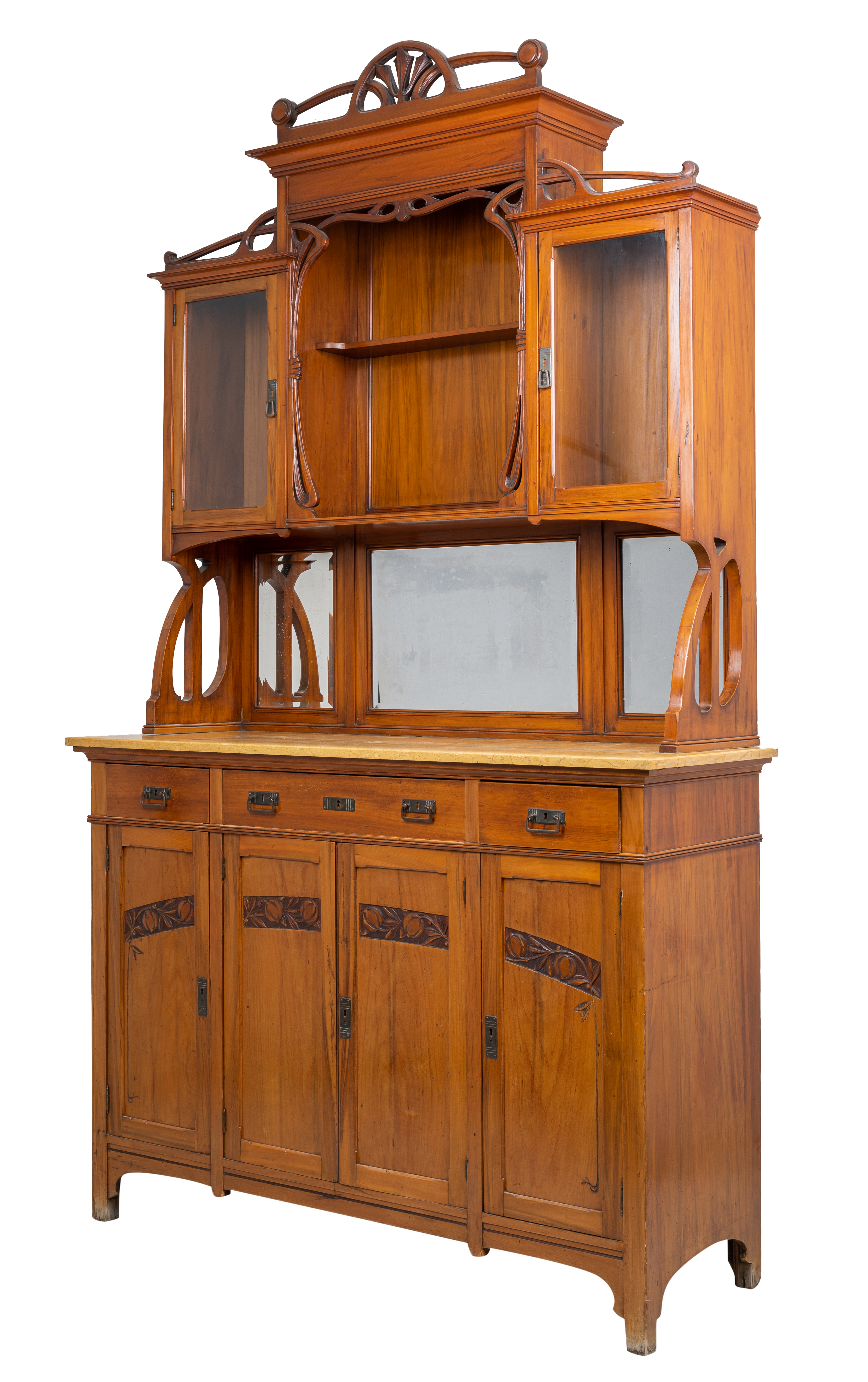 Piattaia con alzata in legno di ciliegio, con quattro ante e tre cassetti nella parte sottostante, piano in marmo di Siena.