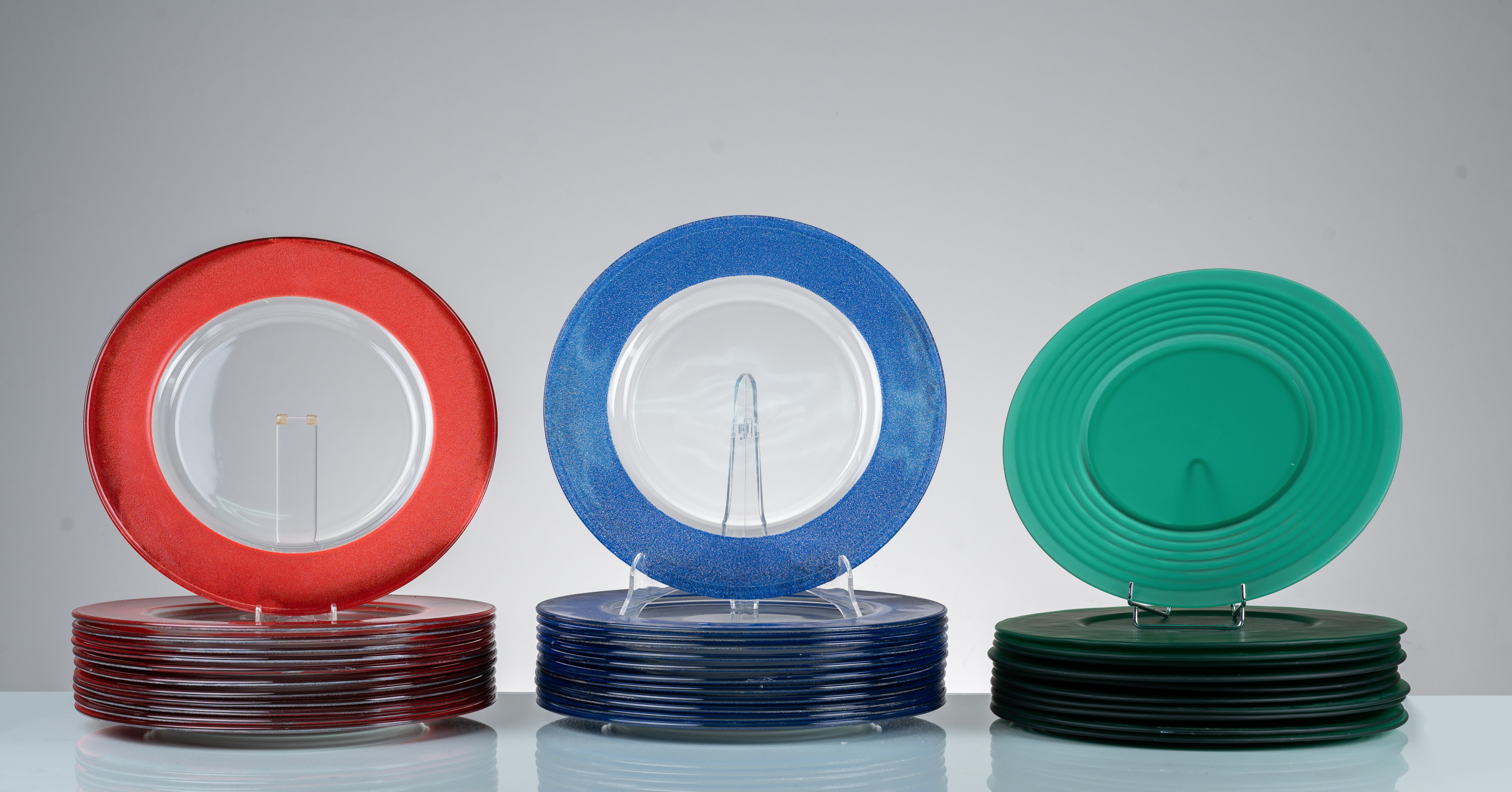 Trentasei sottopiatti circolari in vetro incolore trasparente, dodici con bordo rosso, dodici con bordo blu e dodici con bordo verde.