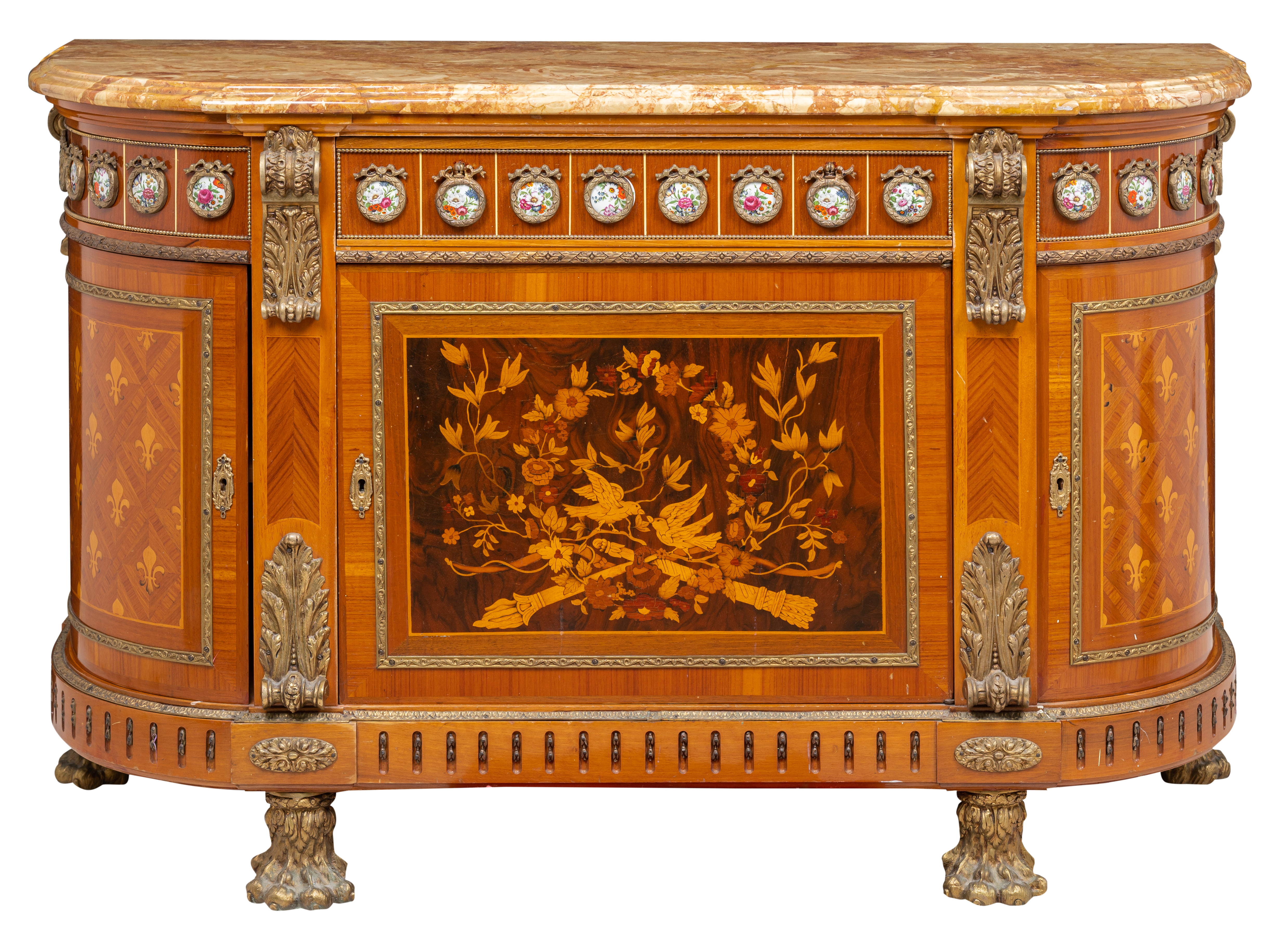 Credenza di forma bombata di gusto francese a tre ante in legno di rosa, riccamente intarsiata con placche in porcellana dipinte, fregi in bronzo.