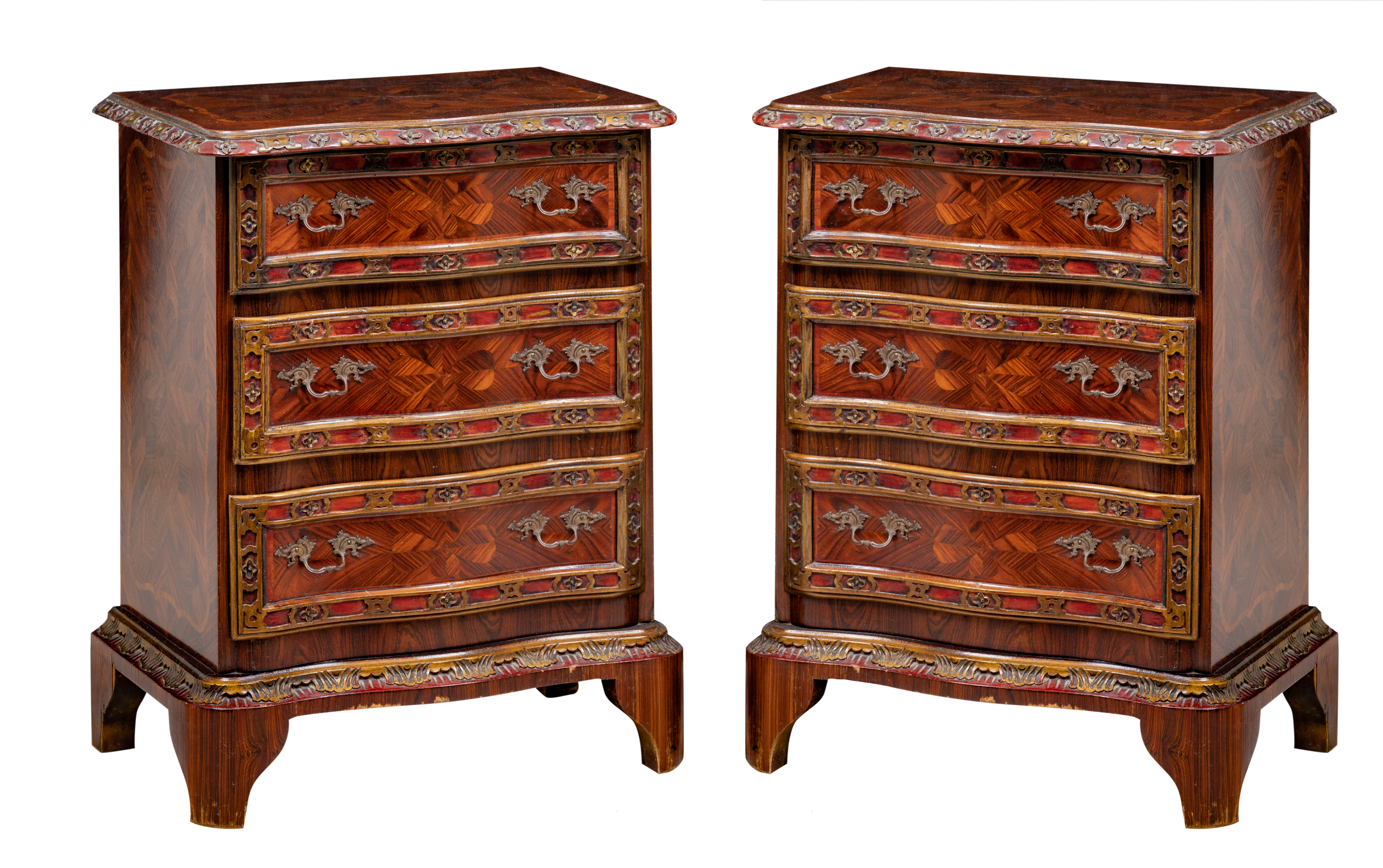 Trittico composto da cassettone a tre cassetti e due comodini in ebano violetto, maniglie in bronzo e lumeggiature in oro.