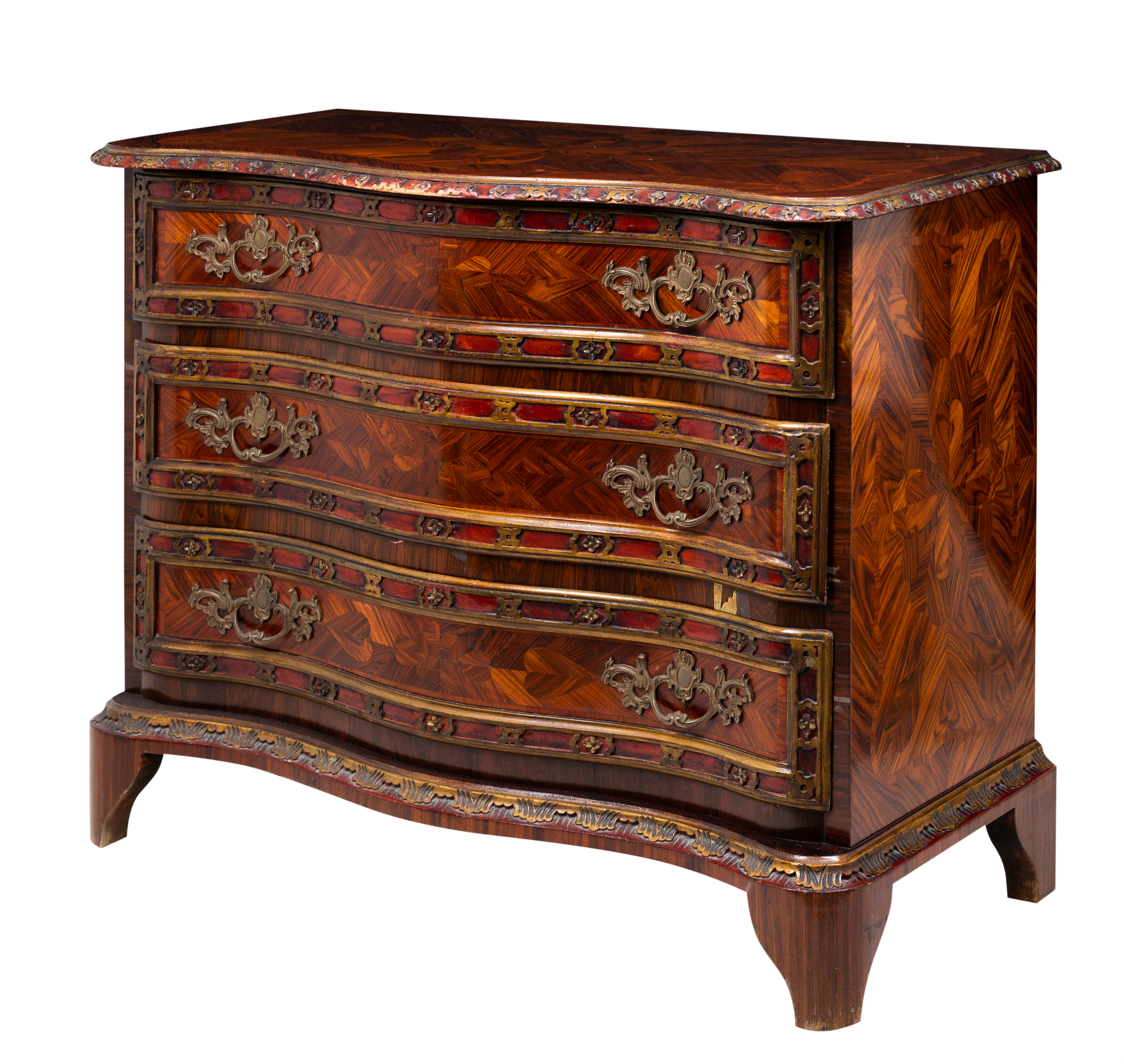 Trittico composto da cassettone a tre cassetti e due comodini in ebano violetto, maniglie in bronzo e lumeggiature in oro.
