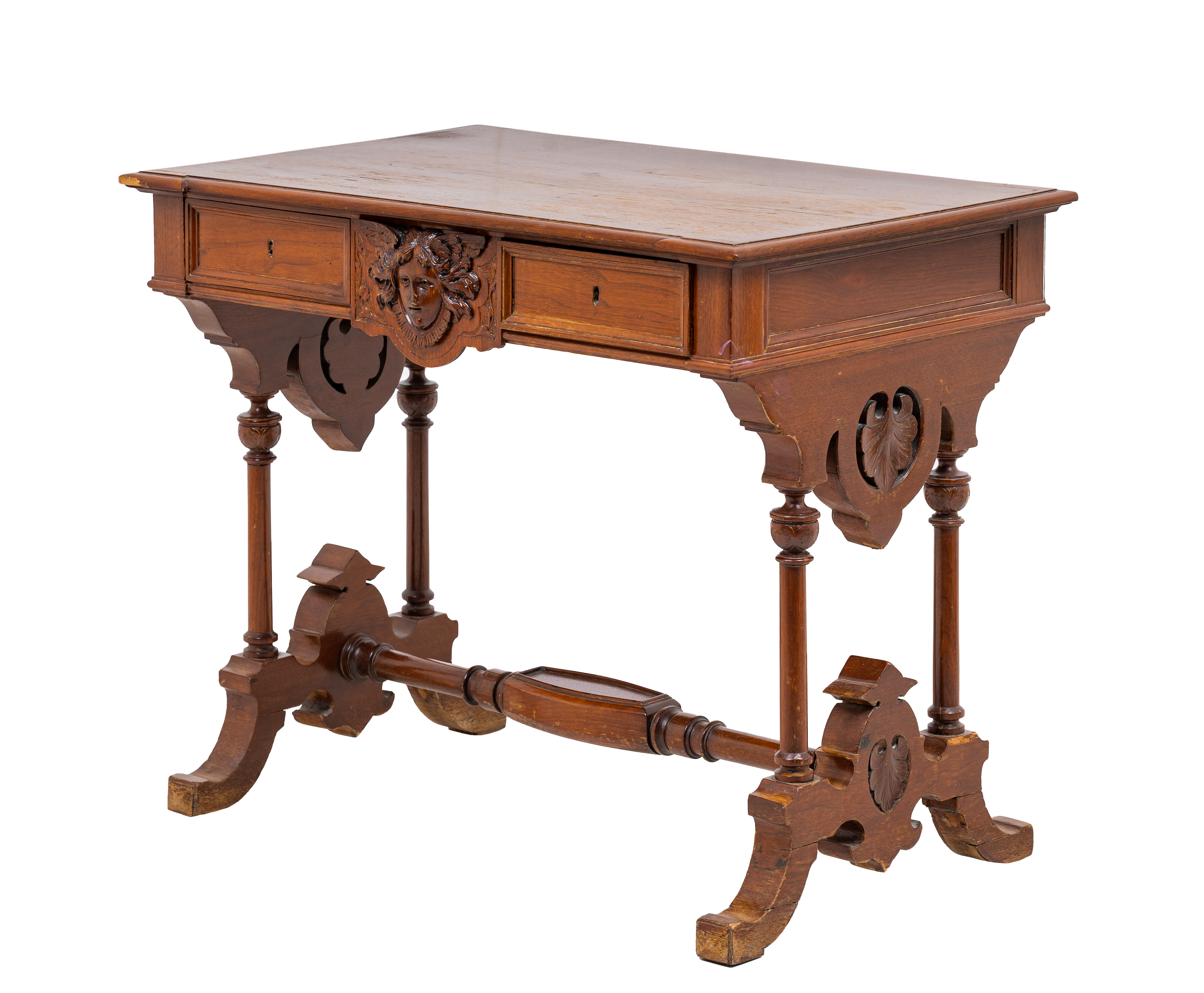 Piccolo scrittoio umbertino con due cassetti in legno di noce.
