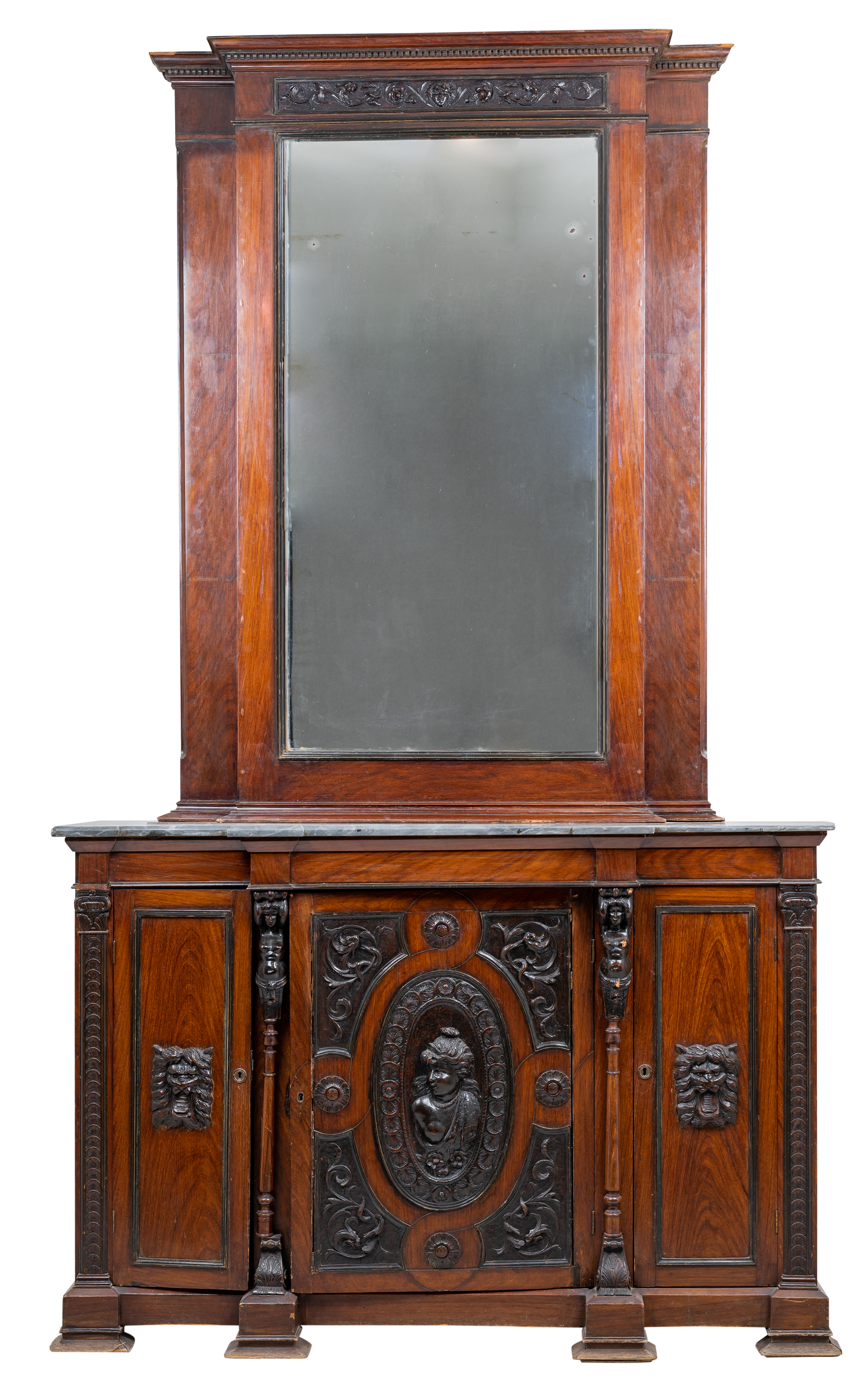 Etagere con specchiera a tre ante in legno esotico, piano in marmo grigio venato.