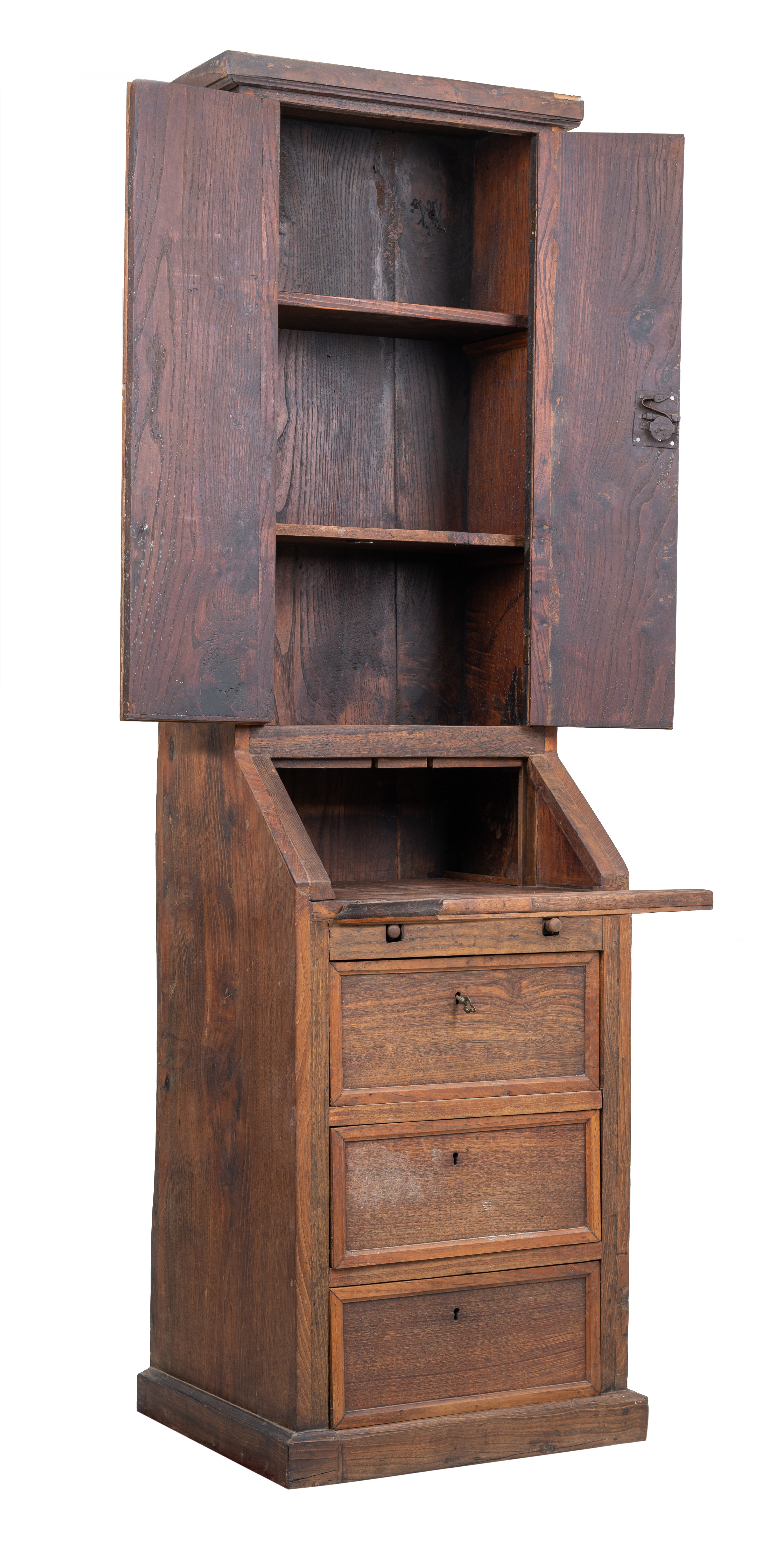 Piccolo trumeau rustico in legno di castagno con tre cassetti inferiori, ribaltina, due ante superiori.