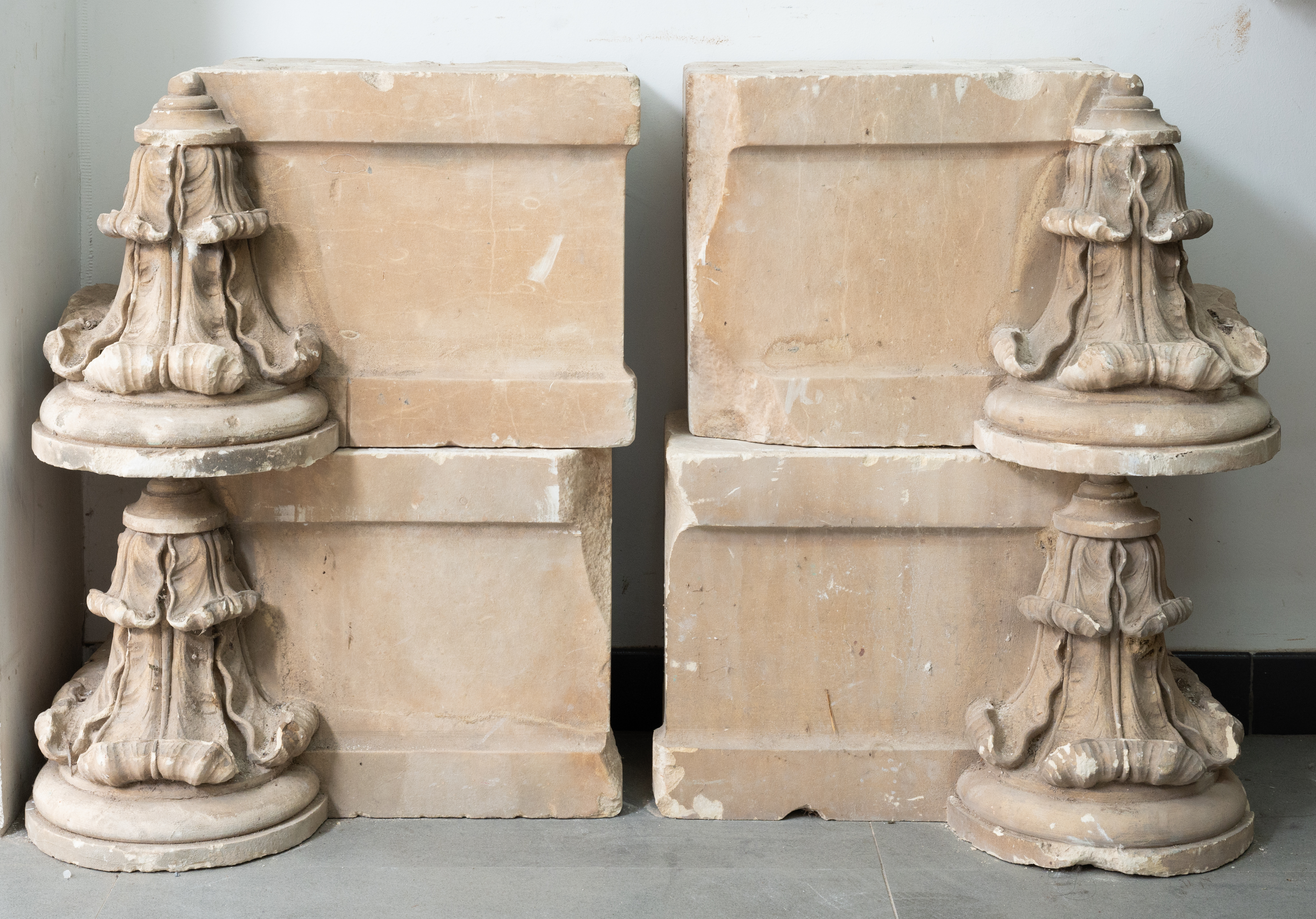 Quattro elementi architettonici in pietra bianca stile neogotico.