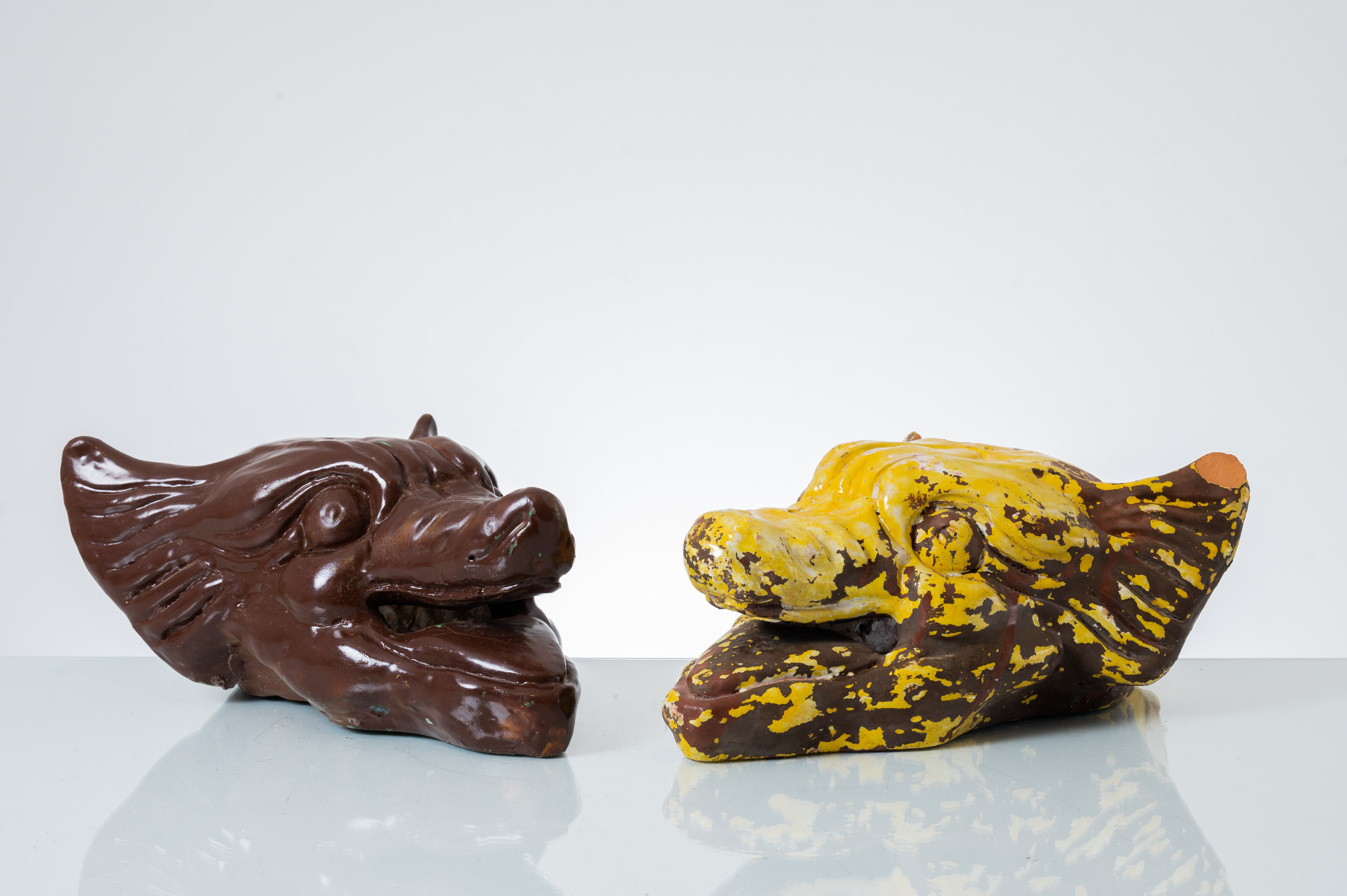 Due doccioni in terracotta smaltata raffiguranti "Teste di animali mitologici".