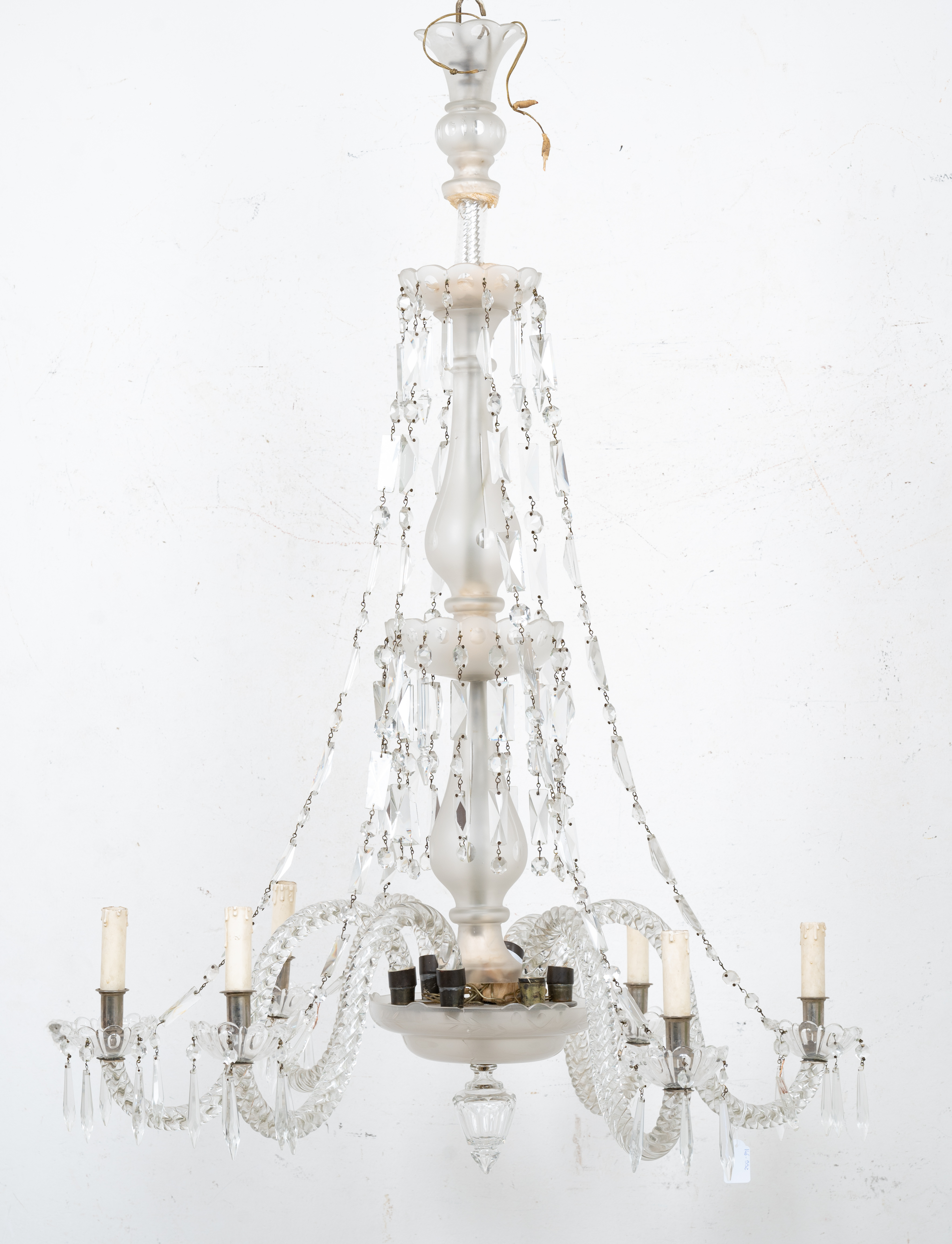 Lampadario a sei luci in vetro con prismi e brindoli (elettrificato).