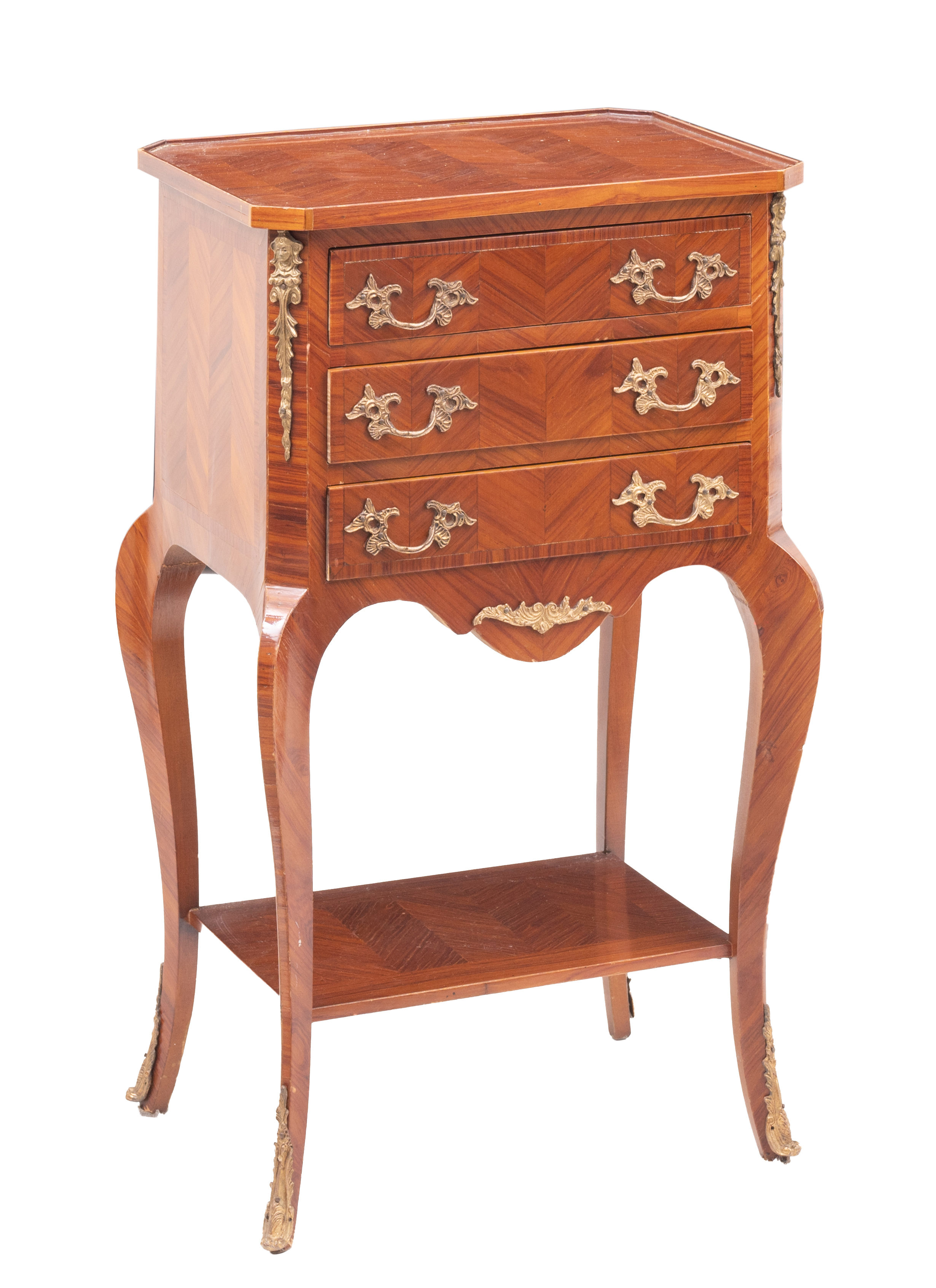 Piccolo mobile a tre cassetti in bois de rose con varie essenze di legno da frutto.