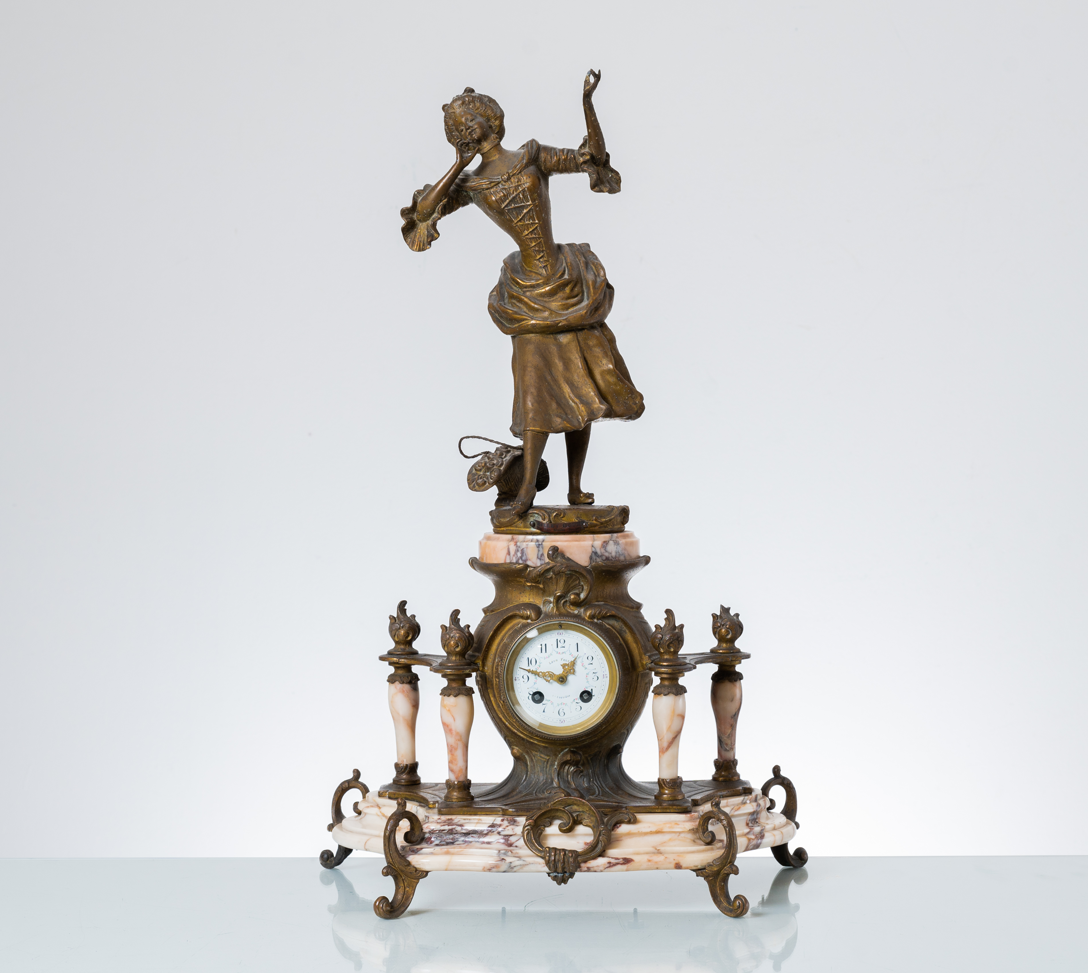 Orologio in marmo e antimonio con scultura nella parte superiore raffigurante "Fanciulla" (usure).