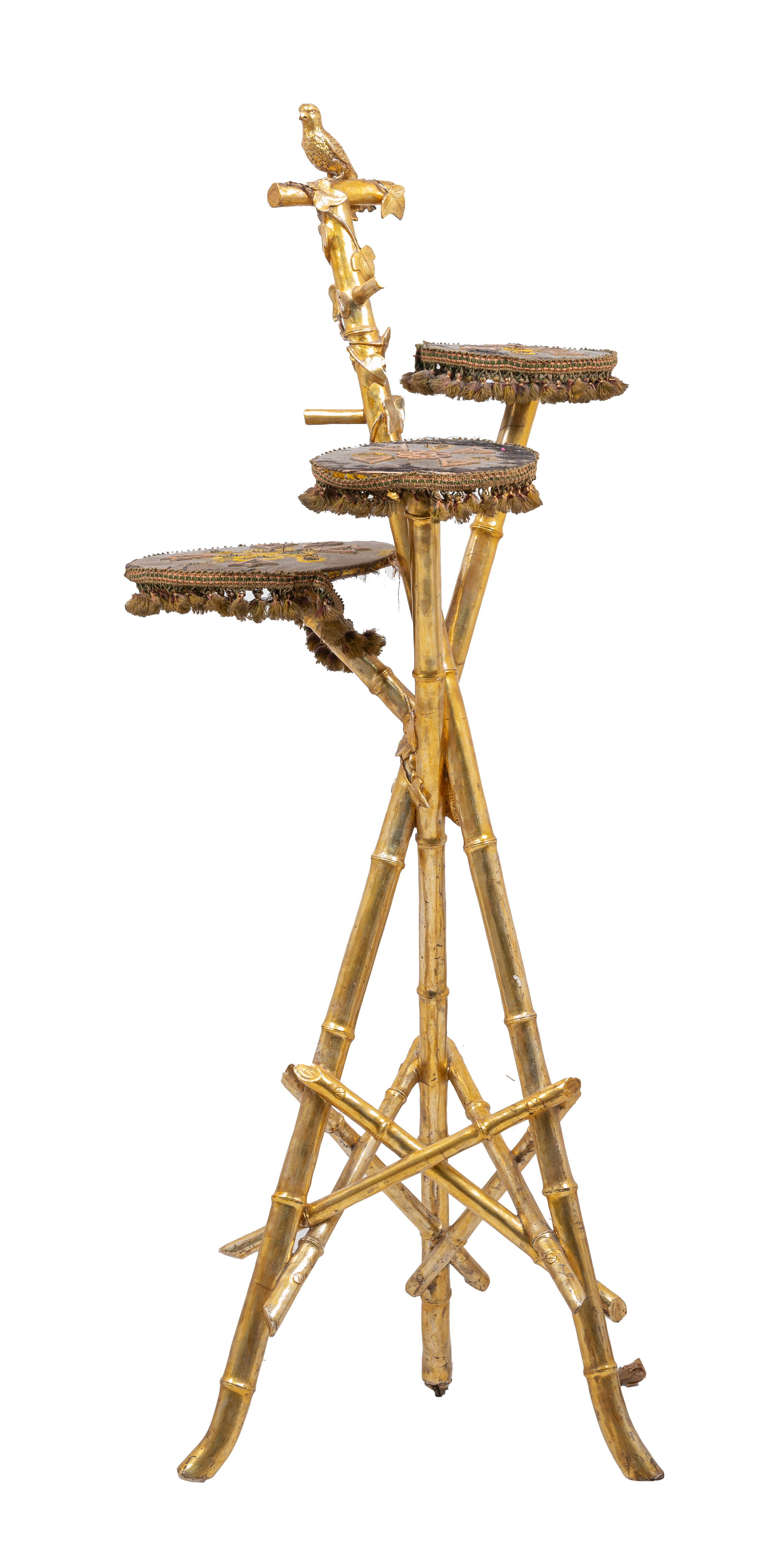 Alzata eclettica a tre ripiani in legno dorato ad oro zecchino.