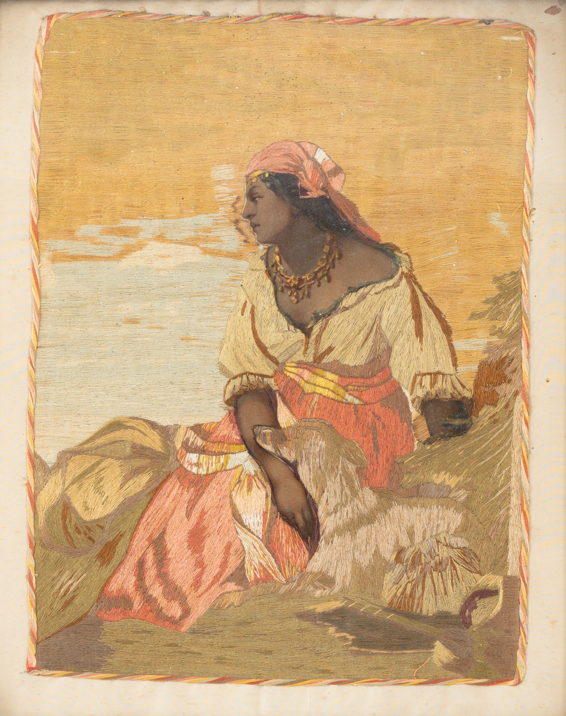 Pannello in stoffa ricamata a mano raffigurante "Figura femminile con cane" entro cornice.