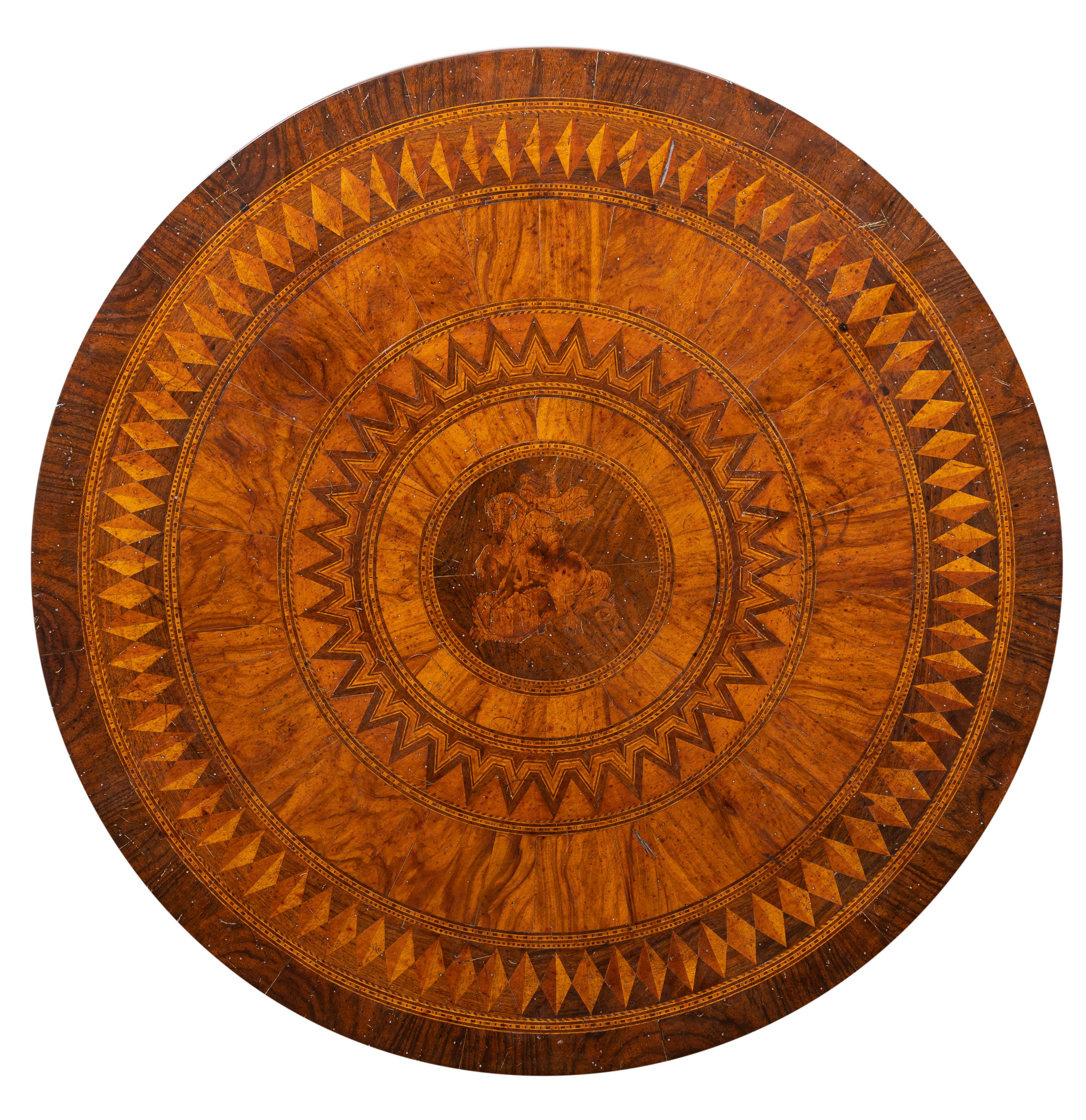 Tavolo da centro a vela, di forma circolare in legno di noce, di gusto sorrentino, riccamente intarsiato in varie essenze di legno a disegno geometrico, decoro al centro raffigurante "San Giorgio che uccide il drago".