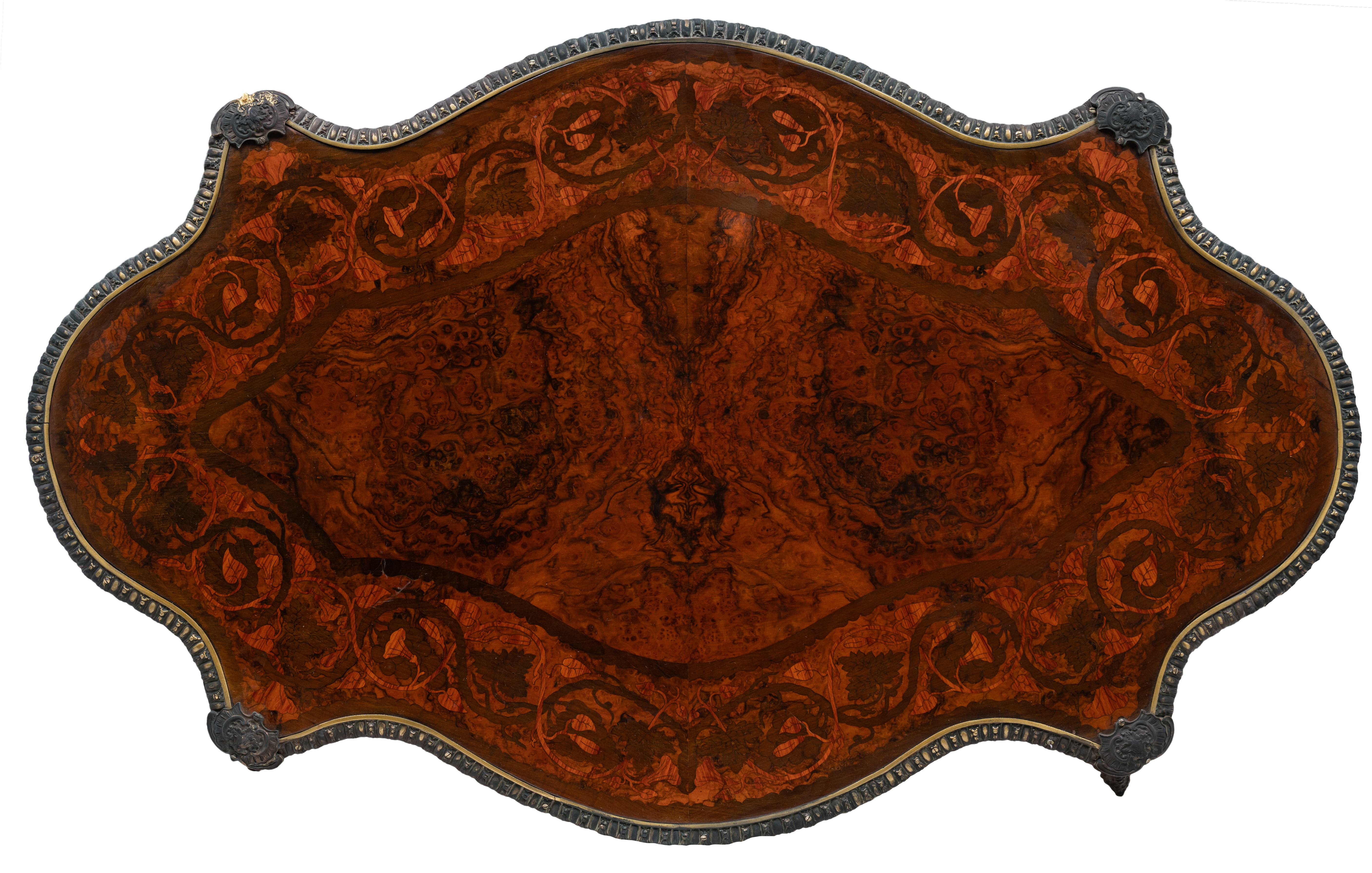 Tavolo da centro di forma sagomata con cassetto in legno di noce, gusto settecentesco, riccamente intarsiato in legno di rosa, guarniture in bronzo dorato.