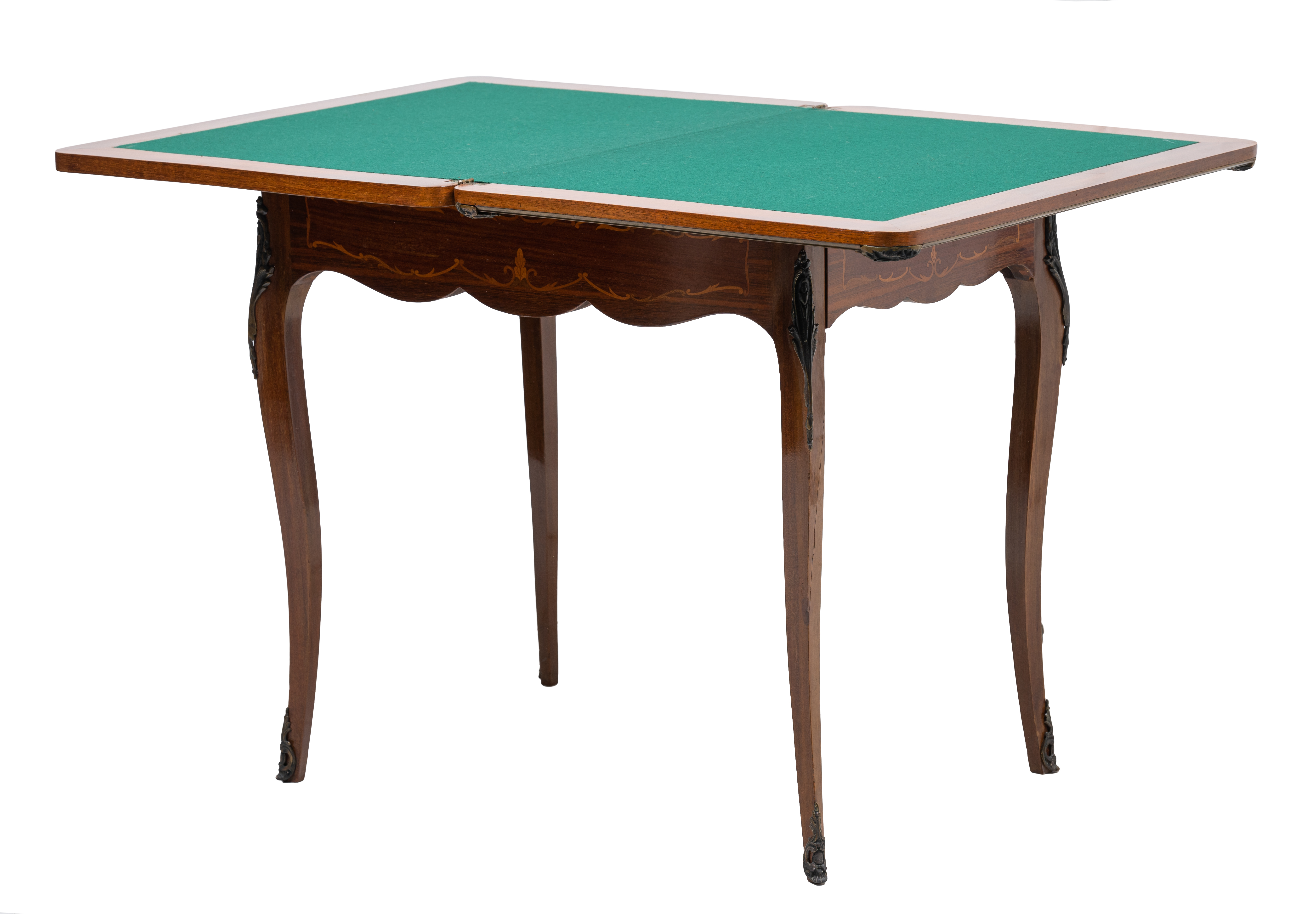 Tavolo da gioco in bois de rose, piano intarsiato in varie essenze da frutto.