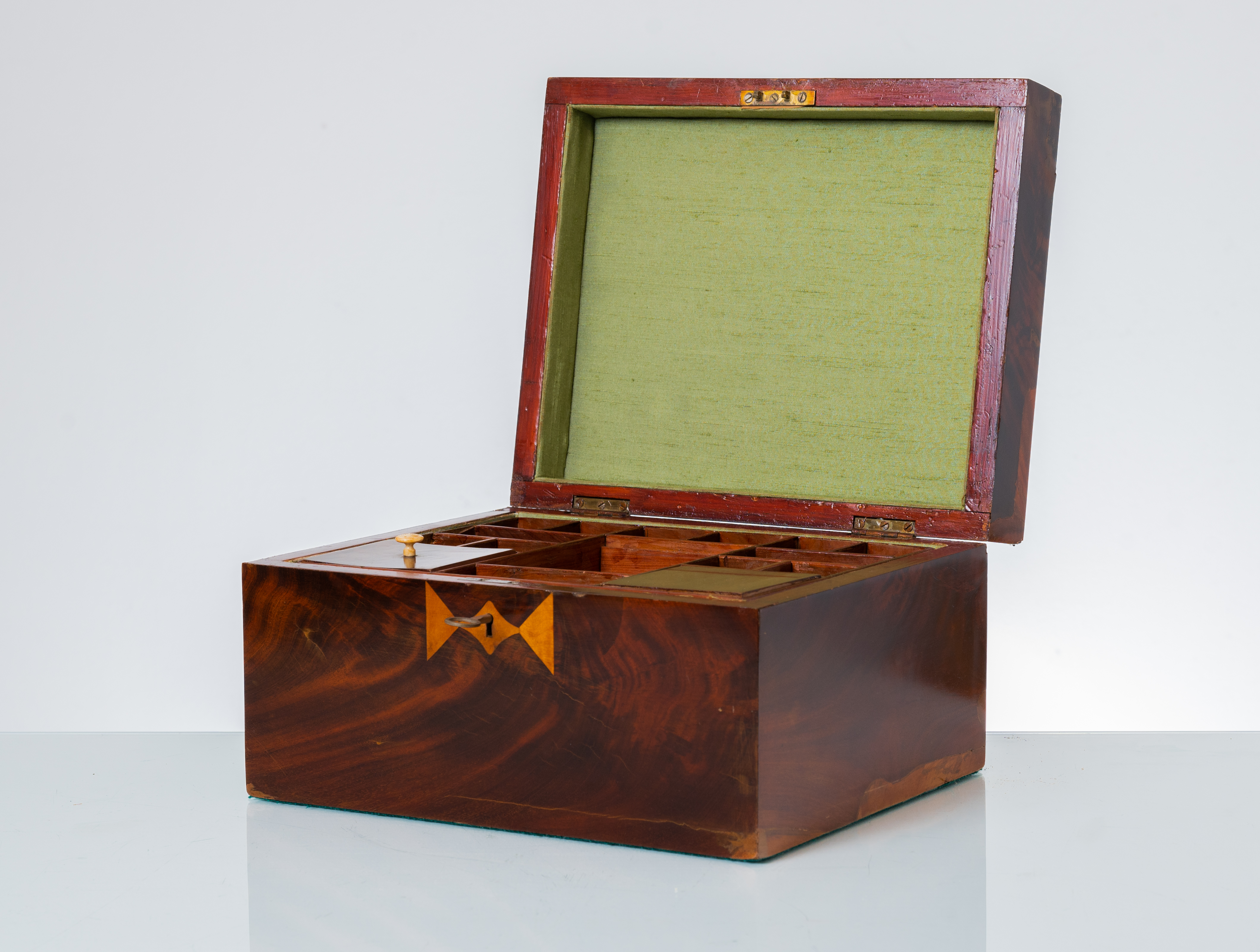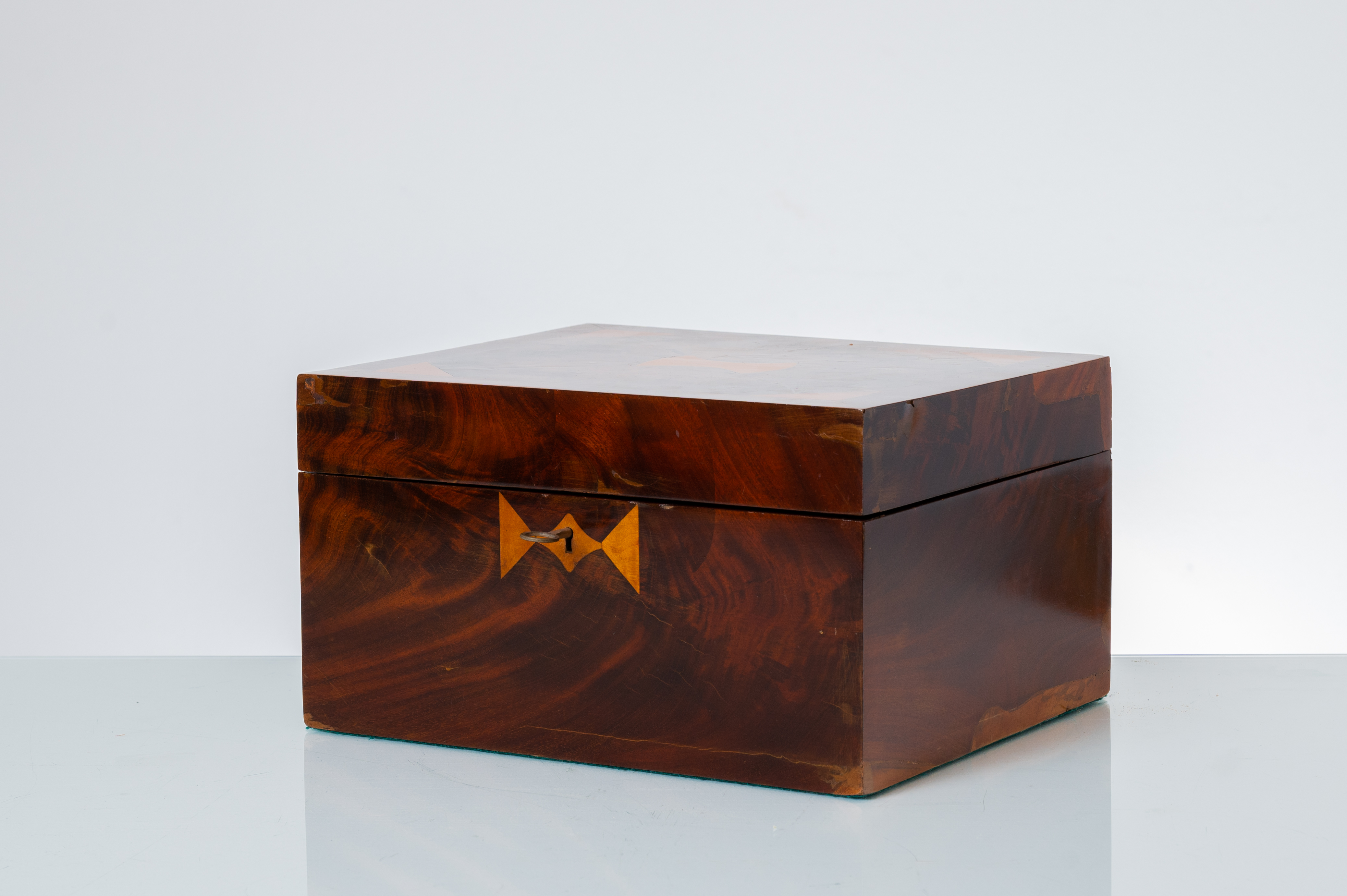 Cassetta portagioie in legno di mogano, radica di tuja e bosso.