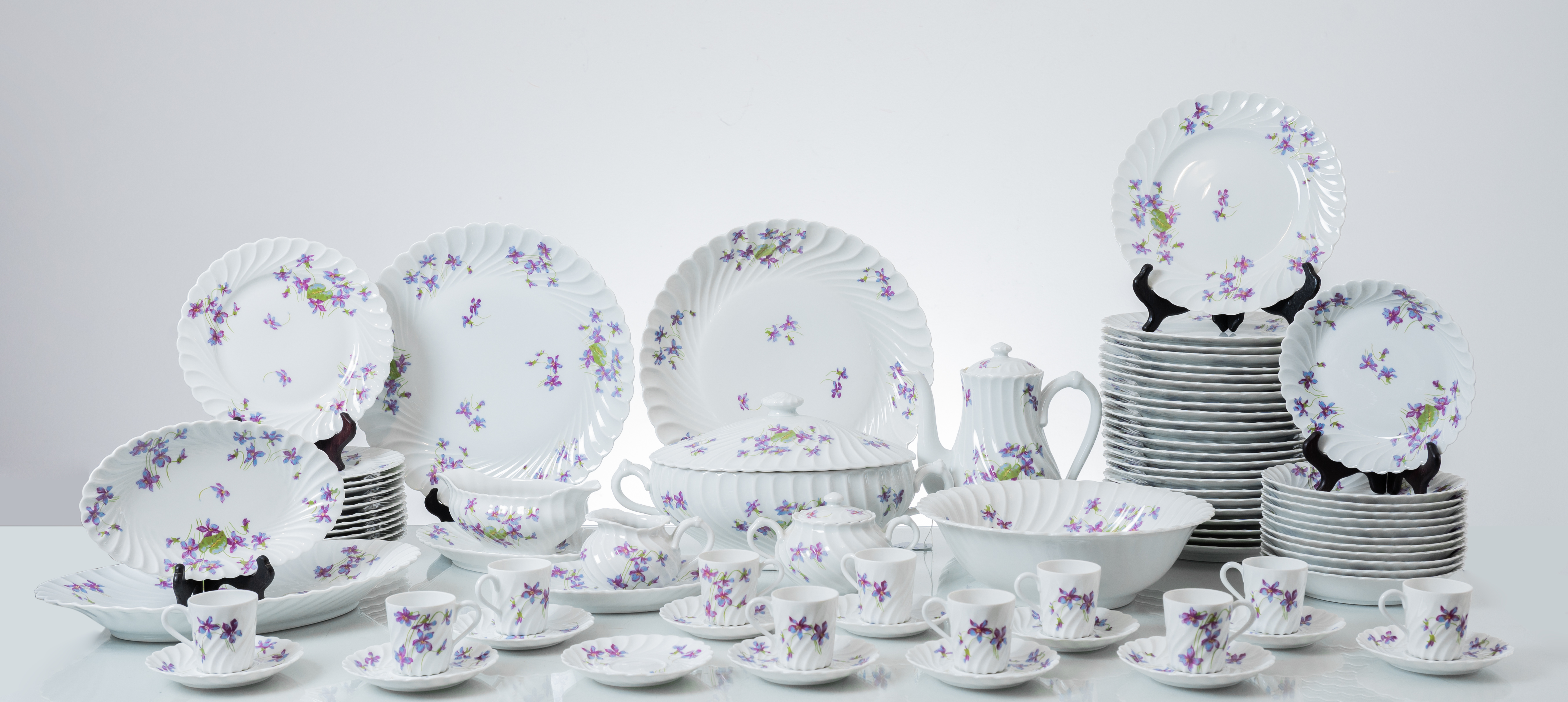 Servizio di piatti in porcellana bianca con decori a motivo floreale composto da zuppiera, due piatti da portata rotondi, piatto da portata di forma ovale, due raviere, insalatiera, salsiera, ventiquattro piatti piani, dodici piatti fondi, dodici piatti frutta, caffettiera, lattiera, zuccheriera e undici tazzine da caffè con dodici piattini.