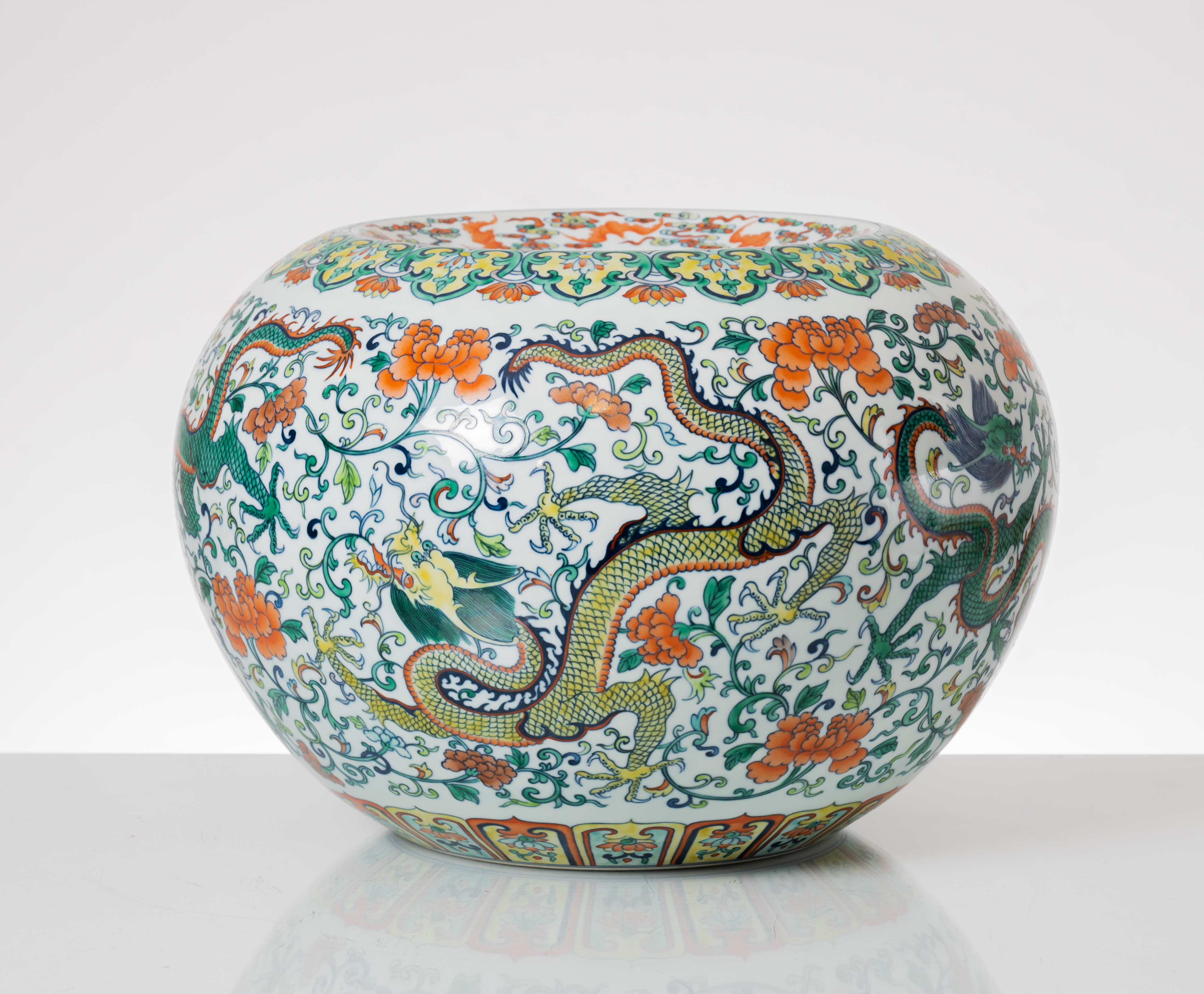 Vaso in ceramica dipinta e decorata a motivo di dragoni e floreale.