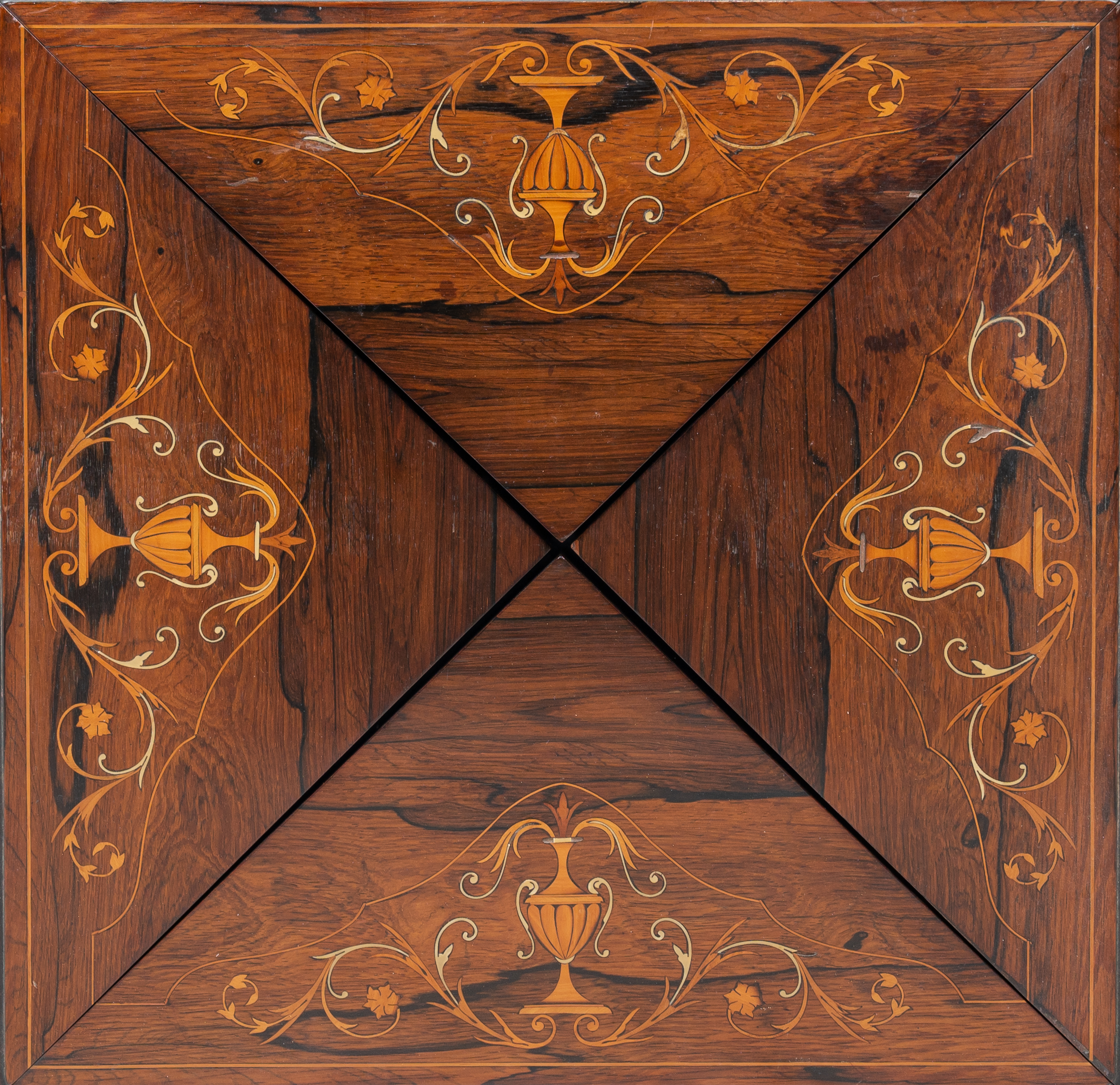 Tavolino da gioco a fazzoletto con cassetto laterale in legno esotico, tarsie in bosso e osso.
