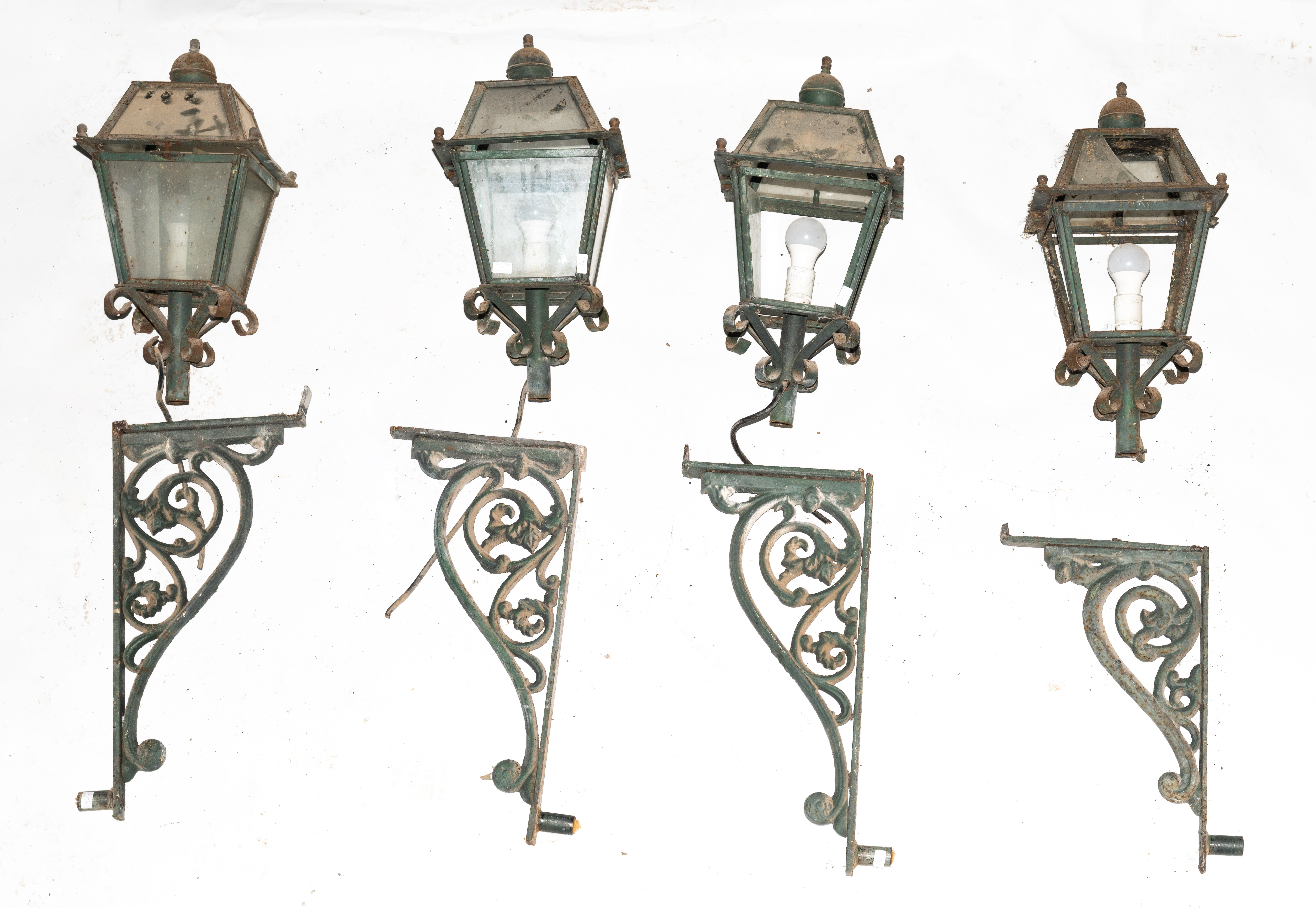 Quattro fanali da muro con bracci in ghisa.