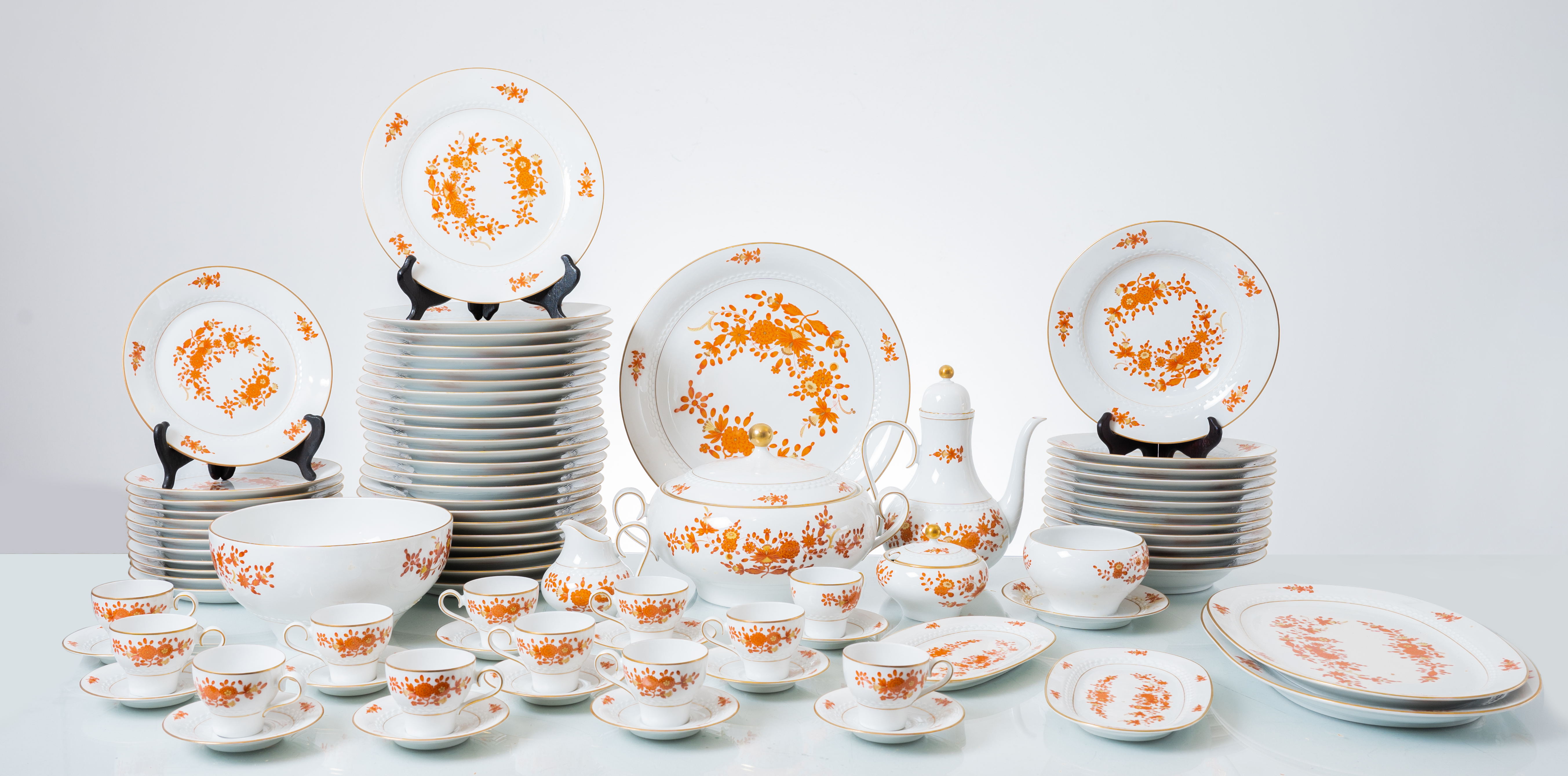 Servizio in porcellana Tirschenreuth bianca con decori a motivo floreale e fogliaceo nei toni del color salmone composto da piatto da portata circolare, due piatti da portata ovali, zuppiera, insalatiera, salsiera, due raviere, ventiquattro piatti piani, dodici piatti fondi, dodici piatti frutta, caffettiera, lattiera, zuccheriera e dodici tazzine con piattino.