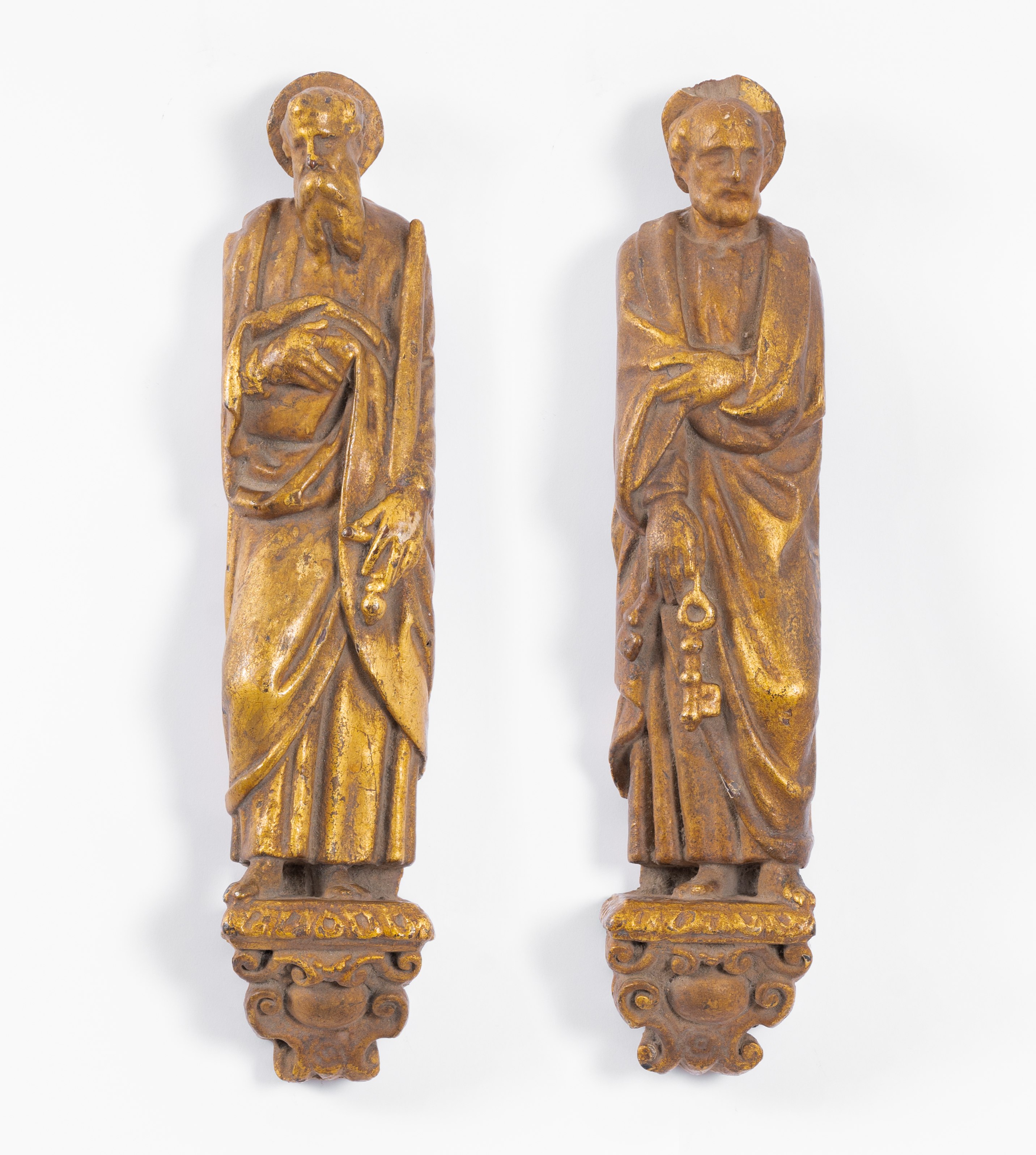 Due sculture in legno dorato raffigurante "San Pietro" e "San Paolo".