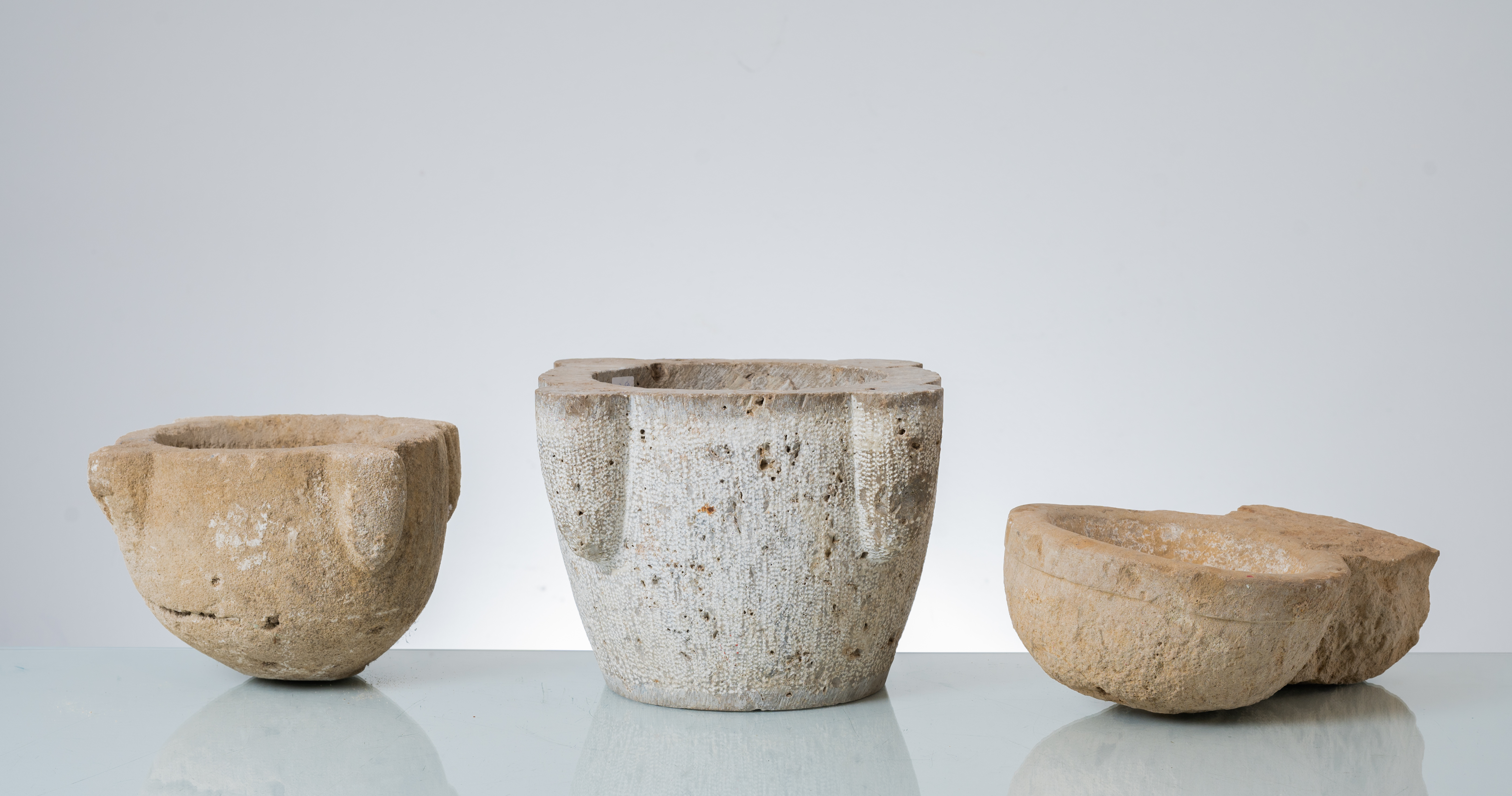 MANIFATTURA SICILIANA XIX SECOLO, Due mortai e acquasantiera