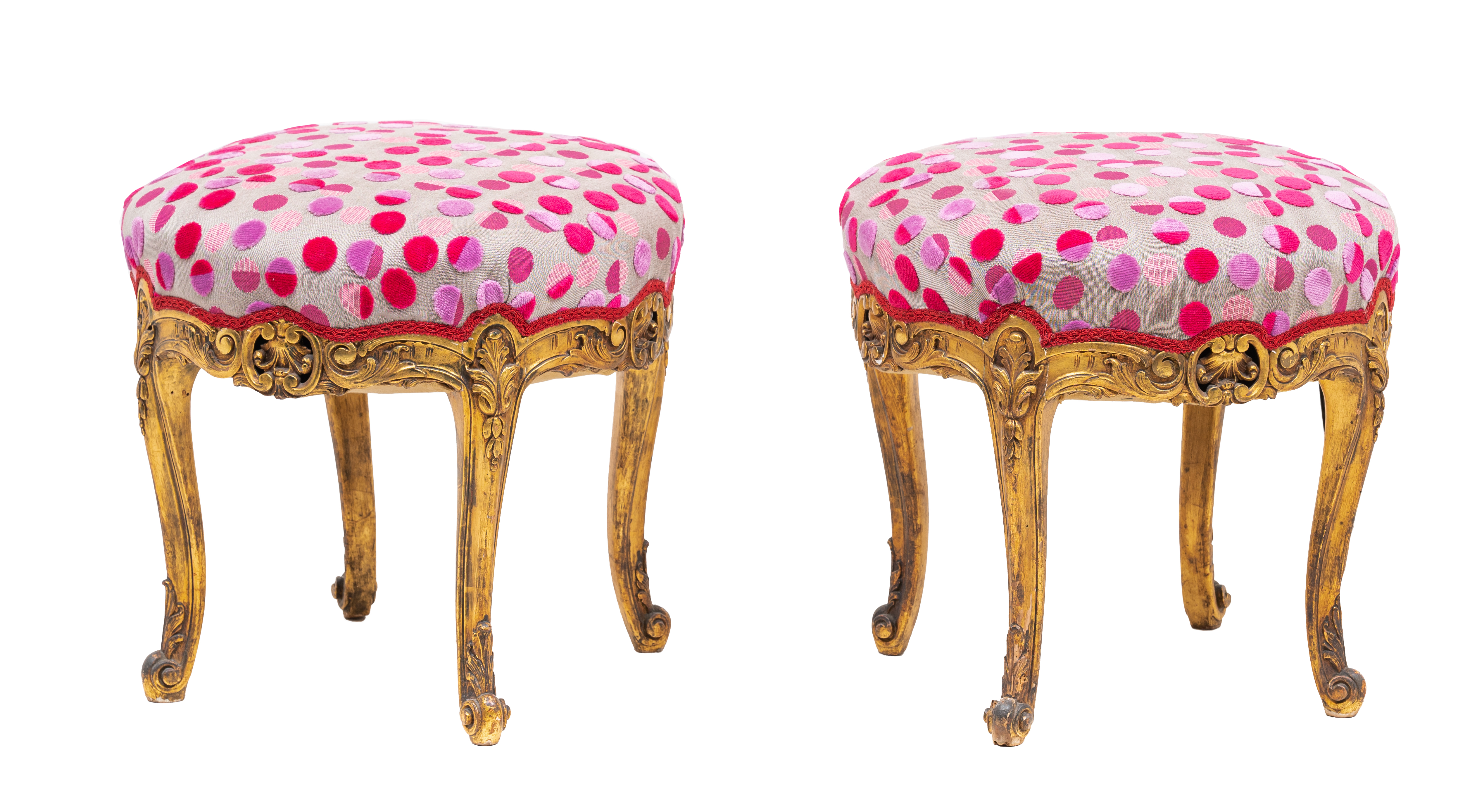 Coppia di pouf rotondi in legno scolpito e dorato, seduta tappezzata.
