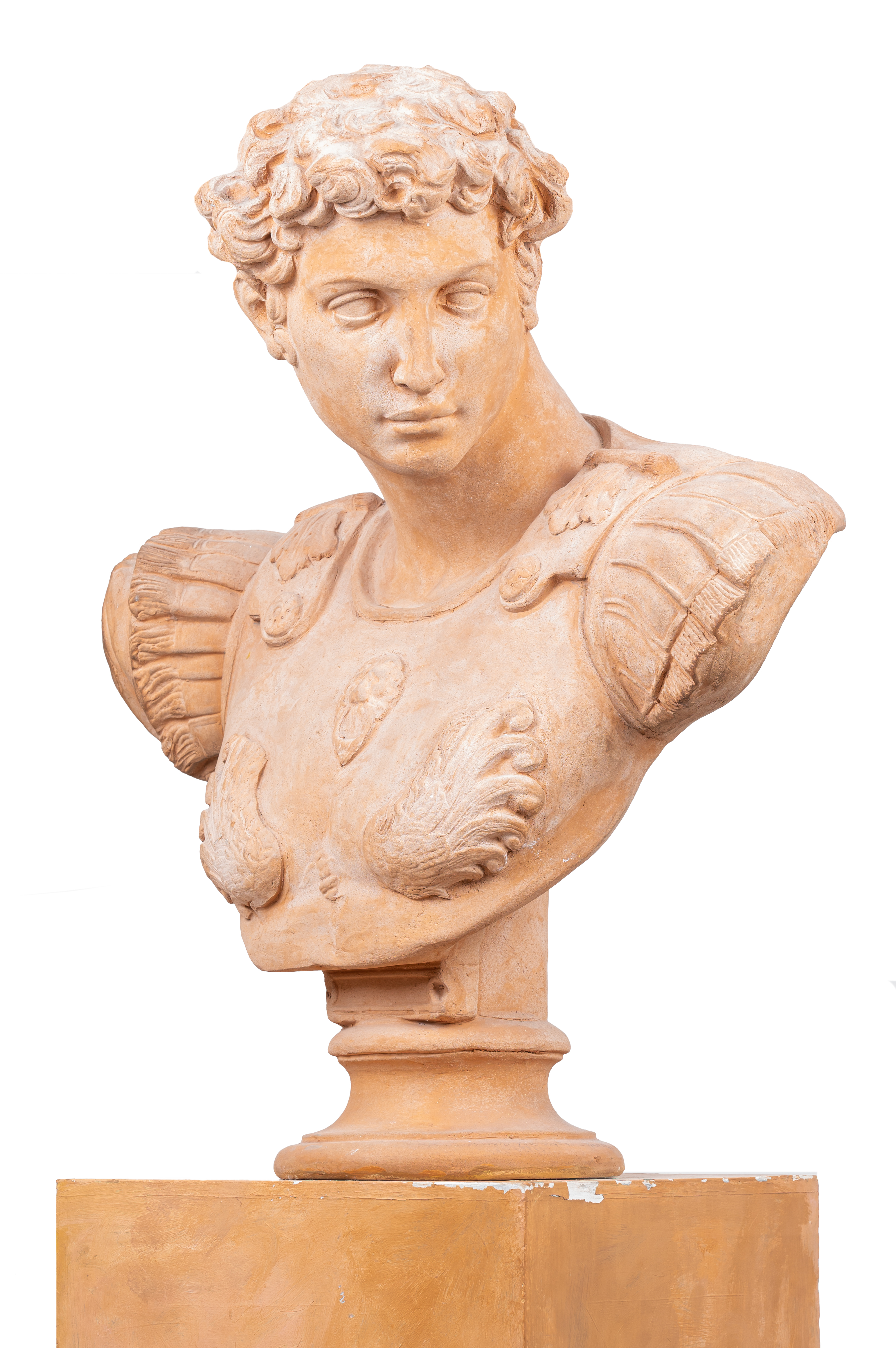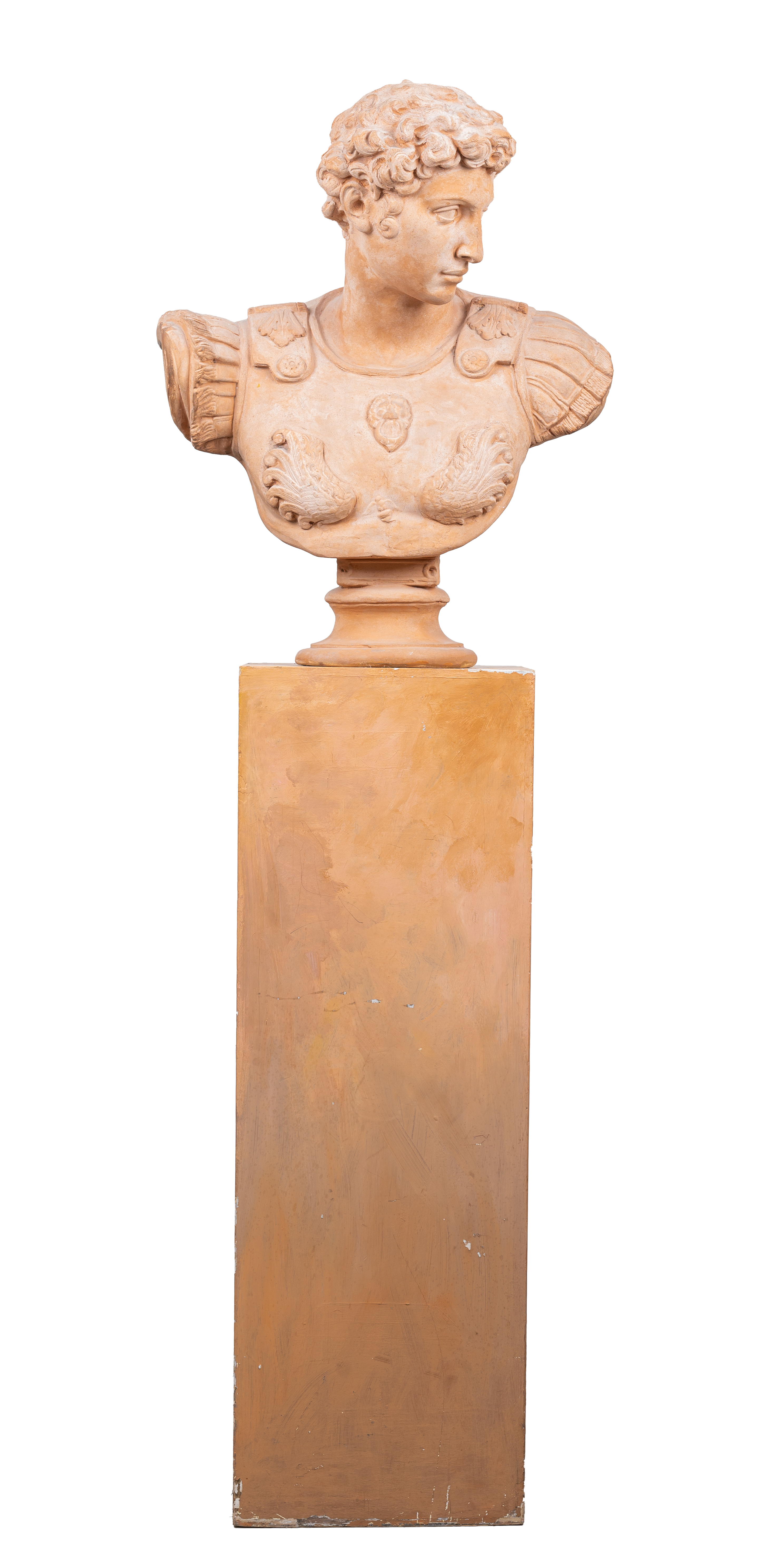 Busto in terracotta raffigurante "Imperatore Romano" con colonna in legno.