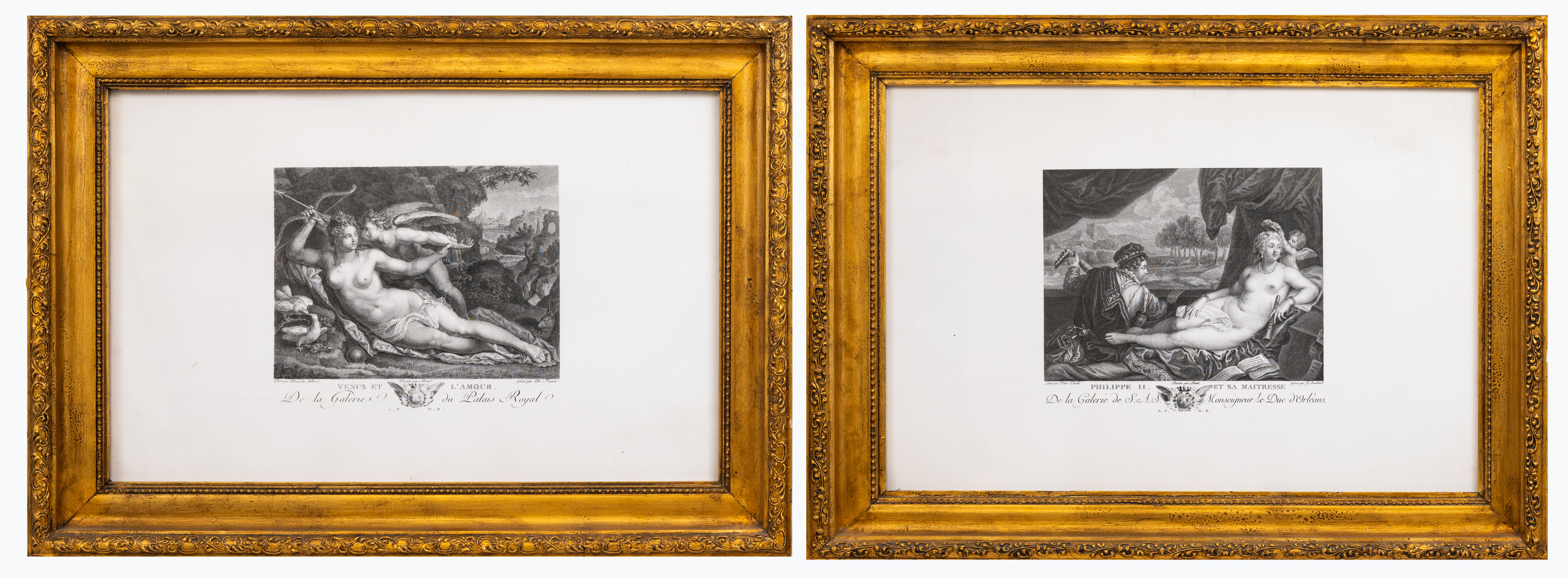 Coppia di cornici dorate con incisioni raffiguranti "Filippo II" e "Scena mitologica".