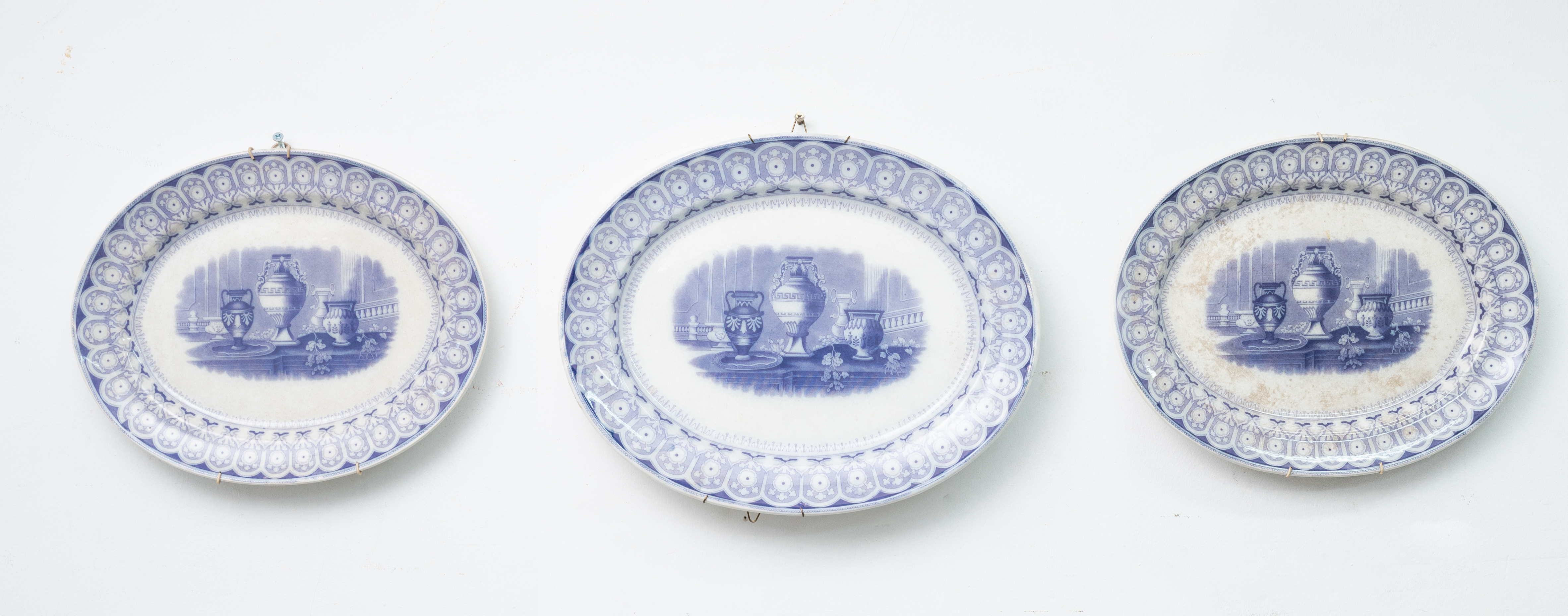 Tre piatti da portata in porcellana decorata a motivo paesaggistico (usure).