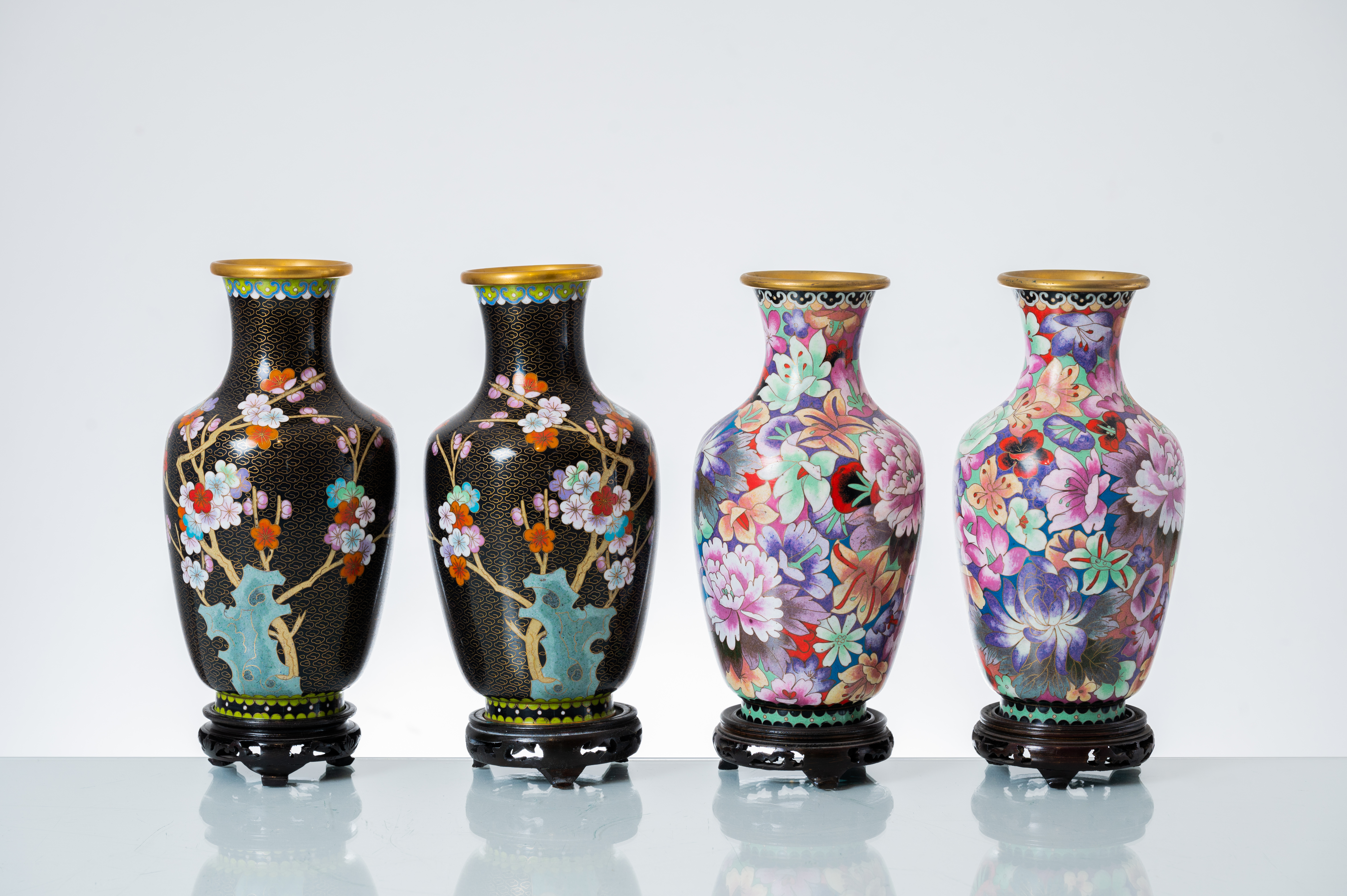 Due coppie di vasi cloisonné con decori a motivo floreale e fogliaceo.