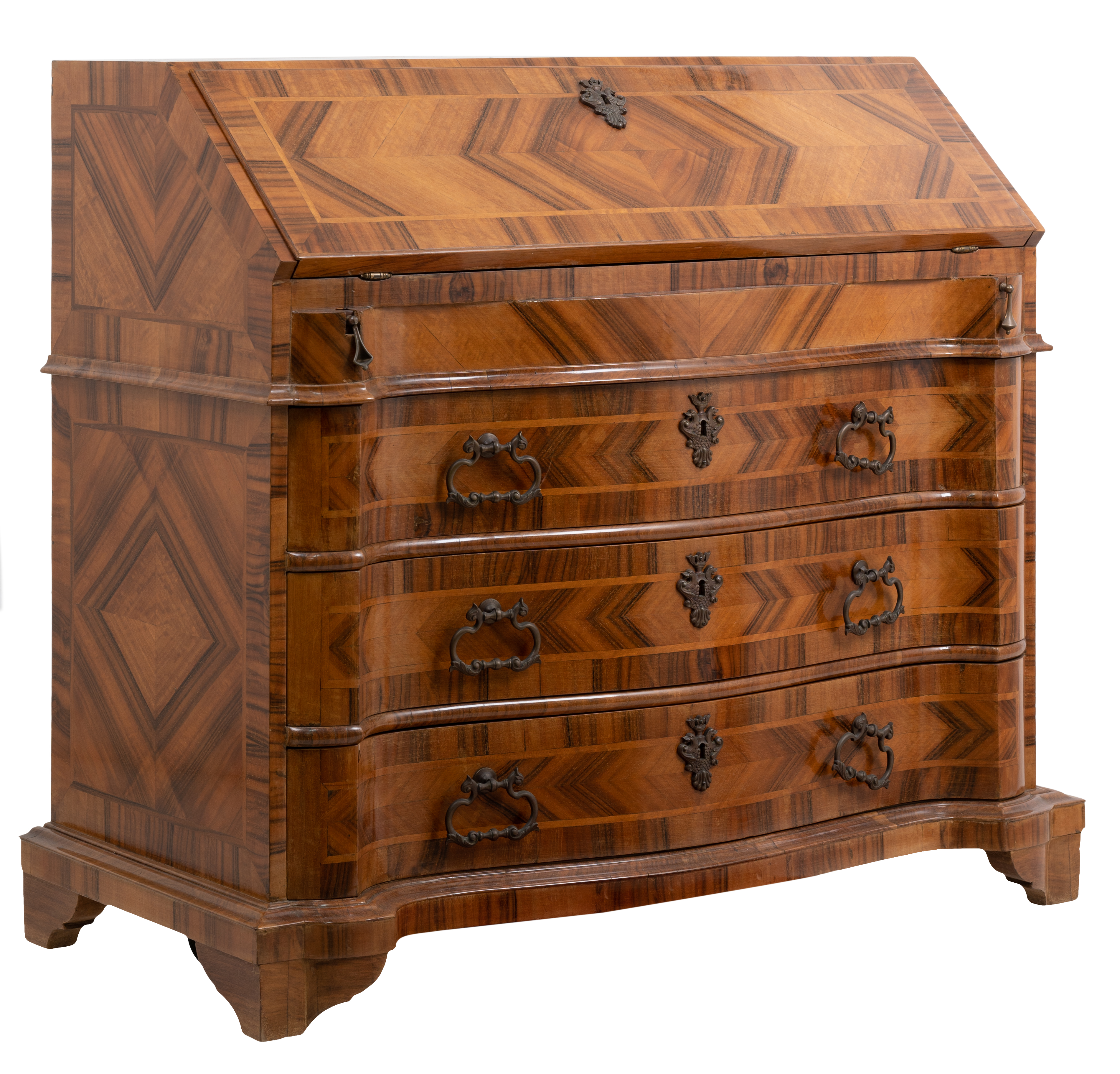 Ribalta stile Luigi XIV a tre cassetti in legno di noce con filettature in bosso.