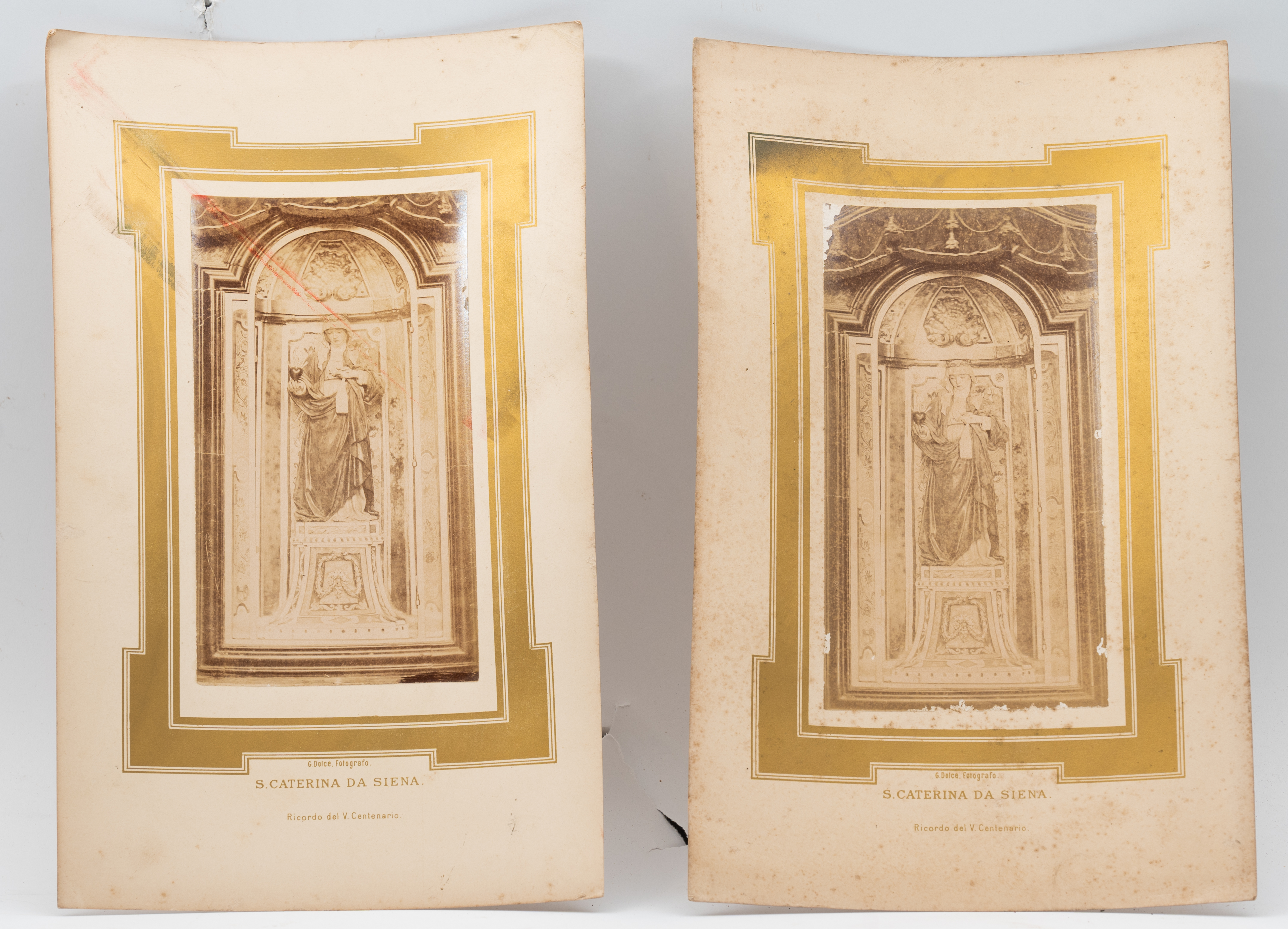 DUE FOTOGRAFIE DI G. DOLCE PER IL V CENTENARIO DI SANTA CATERIAN DA SIENA. La fotografia è stata realizzata nel 1947, per il V centenario della nascita della Santa. Le fotografie misurano cm 19,5 x 31. Le fotografie in seppia sono inquadrate entro cornice dorata.