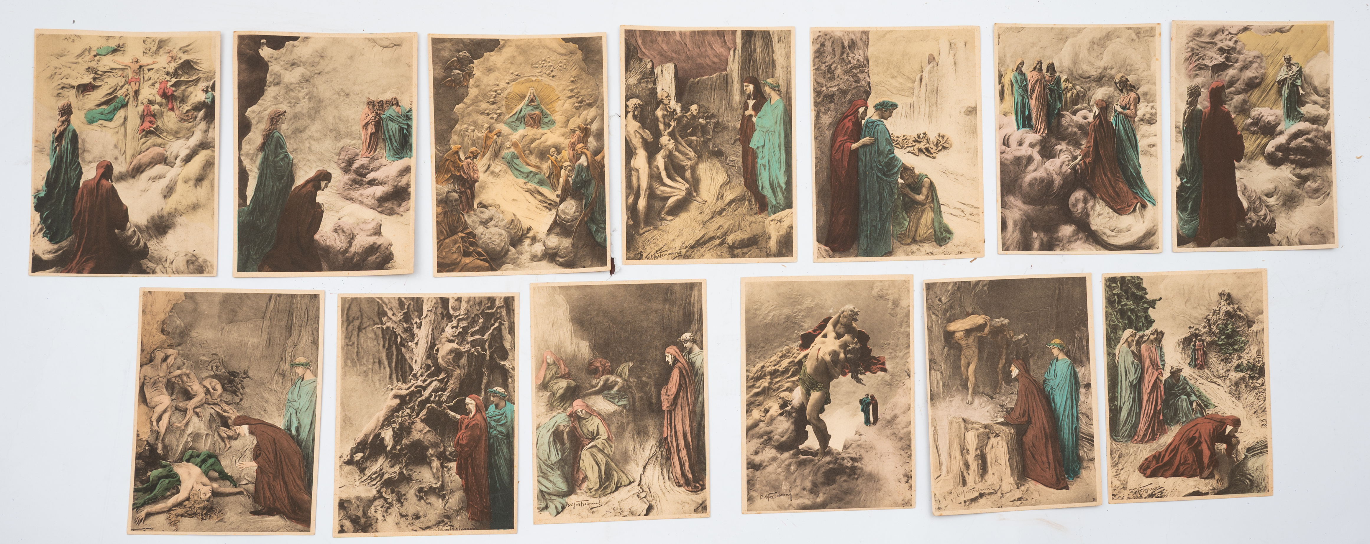 TREDICI TAVOLE A COLORI DI DOMENICO MASTROIANNI. Il pittore Domenico Mastroianni (zio e maestro di Umberto Mastroianni), è famoso per aver creato delle ohriginali "fotosculture" ispirate alla Divina Commedia di Dante, trasformando versi e canti in immagini tridimensionali scolpite e poi fotografate, diventate celebri anche come cartoline illustrate, offrendo una visione unica e moderna del poema dantesco. Mastroianni ha sviluppato un metodo chiamato "fotoscultura", che combina scultura e fotografia per catturare momenti chiave e figure della Commedia. Le tavole presenti sono tratte dall’opera in 42 tavole sulla Divina Commedia, e riprodotte come omaggio della “Muchemina”.