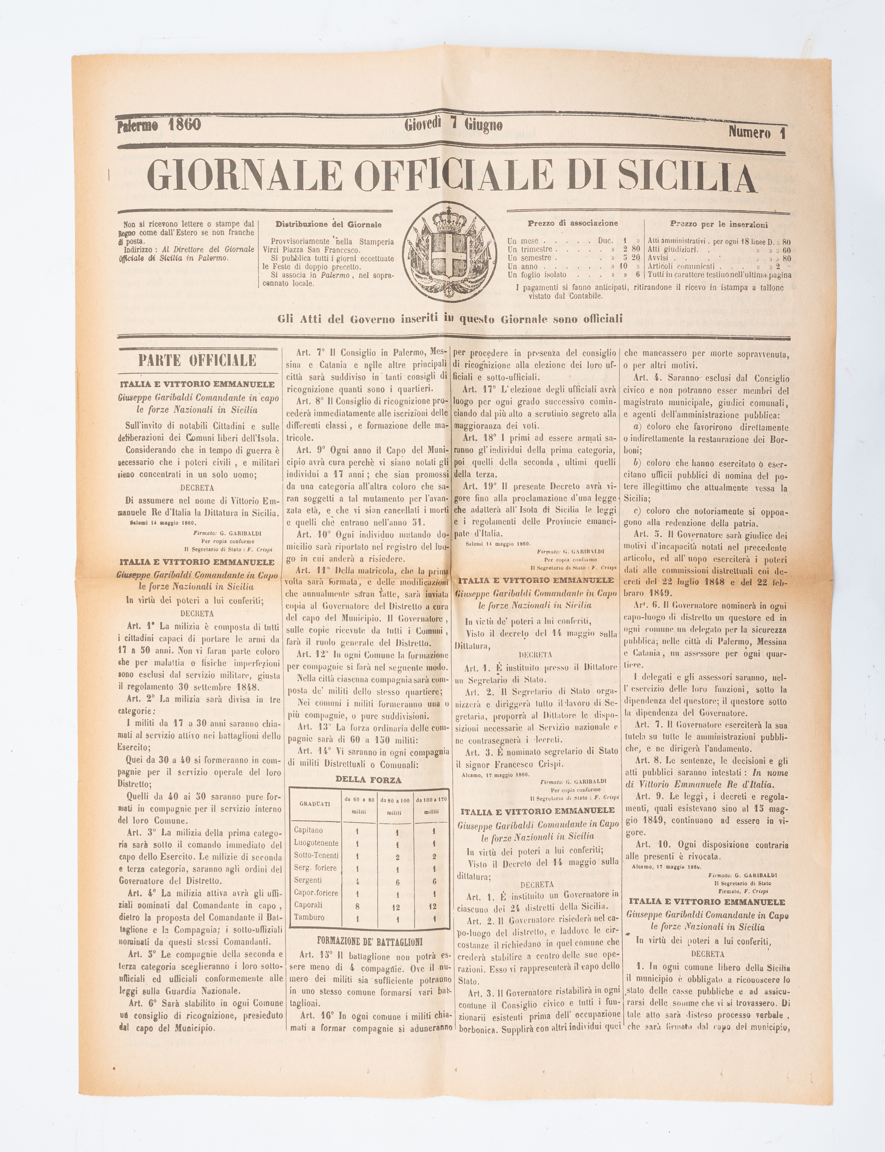 RARA COPIA N. 1 DEL GIORNALE OFFICIALE DI SICILIA, di Giovedì 7 Giugno 1860. Il Giornale Officiale di Sicilia sarebbe poi divenuto nel tempo il Giornale di Sicilia. 4 pagine di cm 40,5 x 56. In eccellenti condizioni.
