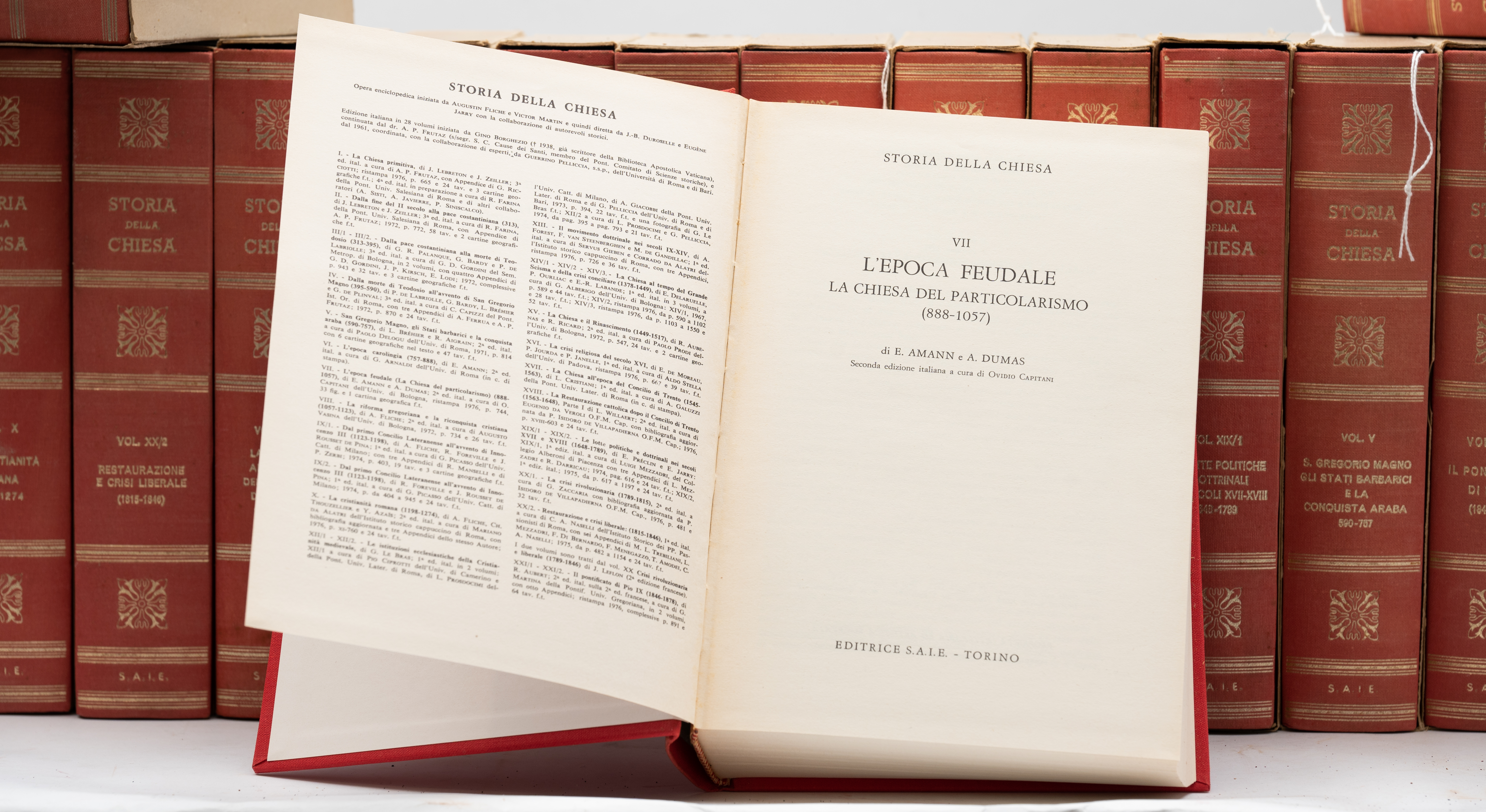 VENTOTTO VOLUMI: STORIA DELLA CHIESA. DALLE ORIGINI AI NOSTRI GIORNI, ed. S.A.I.E., 1976. In 8°. Volumi entro custodie editoriali in cartone. Legature editoriali in piena tela rigida con impressioni in oro ai piatti e titoli, filetti e fregi impressi in oro ai dorsi. Volumi in più che discrete condizioni. Monumentale opera in 28 volumi che offre un'ampia e dettagliata esposizione degli eventi religiosi, ecclesiastici, sociali e culturali della Chiesa cattolica, dalle sue radici apostoliche fino all'epoca moderna, coprendo in profondità vari periodi storici con contributi di vari studiosi, ed è un classico di riferimento per lo studio della storia cristiana.